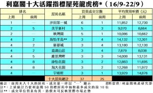 利嘉閣地產研究部主管陳海潮表示,上周適逢中秋佳節及等候美國議息結果出爐,市場氣氛仍趨觀望,故令十大屋苑交投量未見全面活躍。綜合利嘉閣地產分行數據所得,全港十大活躍指標屋苑在上周(16/9–22/9)錄37宗買賣個案,較前周(9/9–15/9)的25宗增加48%,每個屋苑平均錄約3至4宗成交。
