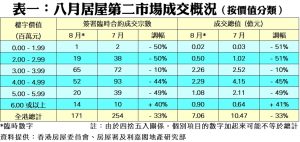 利嘉閣地產研究部主管陳海潮表示,受惠於房委會年初批出「白居二」准買證,未補價居屋交投量曾一度連月攀升;與此同時,居屋業主有感市況明顯轉好,開始變得惜售,紛紛提高單位叫價,令本來急切上車的居屋客逐漸回歸理性,放慢入市步伐,審慎觀望後市動向。據香港房屋委員會及房屋署網頁最新數據,八月份全港錄171宗居屋第二市場買賣個案(按簽署臨時買賣合約的成交為準),較七月份的254宗按月下跌33%,跌勢持續四月;至於八月份未補價物業成交總值約7.06億元,較七月份的10.47億元同步減少約33%,成交量及總值均為近半年新低水平。
