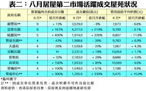 按物業價值劃分(見表一),八月份5個組別交投量按月錄得跌幅,其中價值200萬元以內及200至300萬元以內組別登記量均按月砍半,分別錄1宗及19宗;至於交投最活躍的則為價值300至400萬元以內的未補價居屋單位,八月份共錄得65宗成交,按月下跌10%。若按屋苑劃分(見表二),八月份將軍澳寶盈花園錄4宗成交,按月銳減43%或3宗;而馬鞍山錦豐苑則以9宗買賣成為該月居屋第二市場交投最活躍的屋苑,成交總額涉資約3,529萬元。