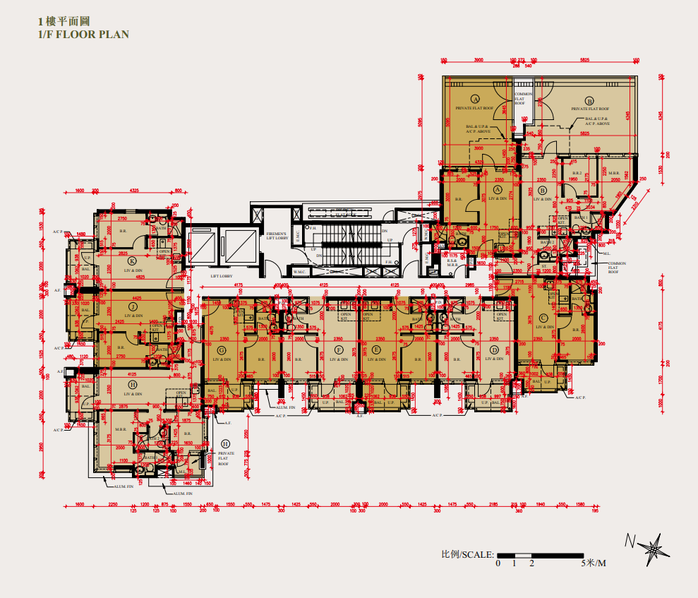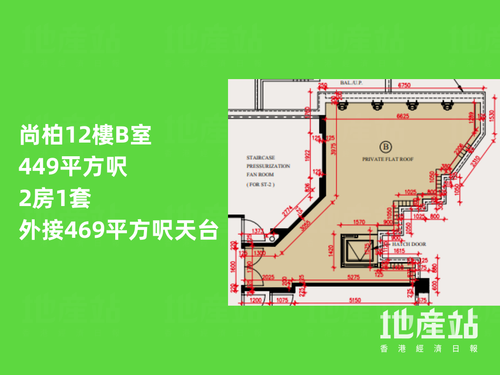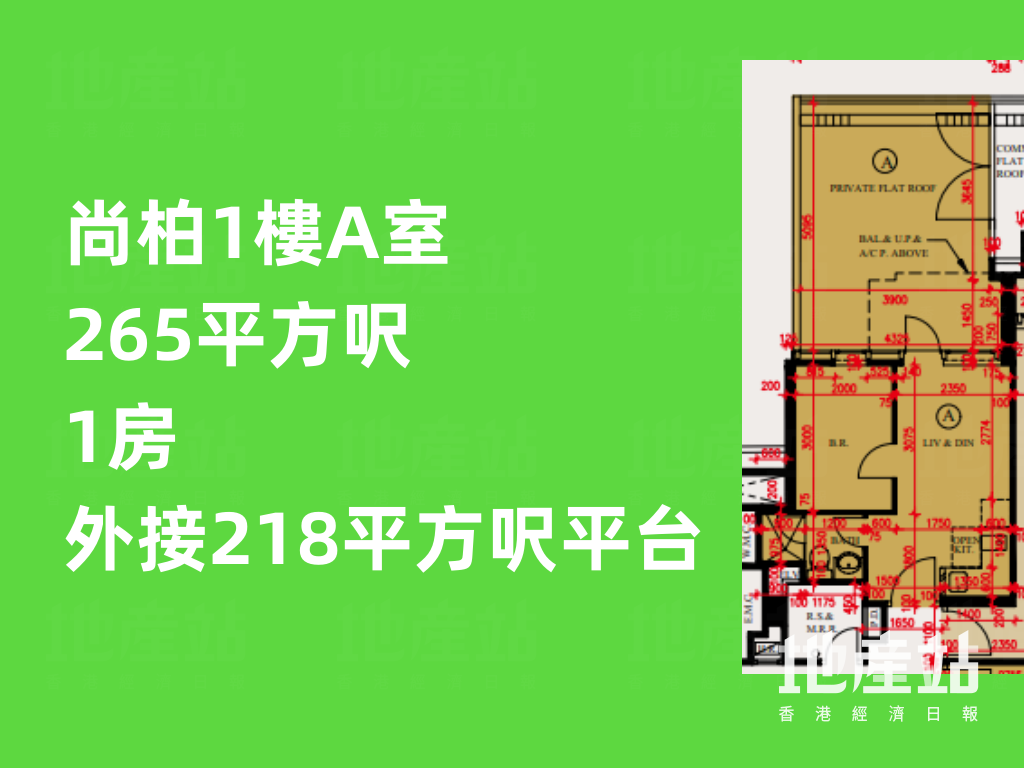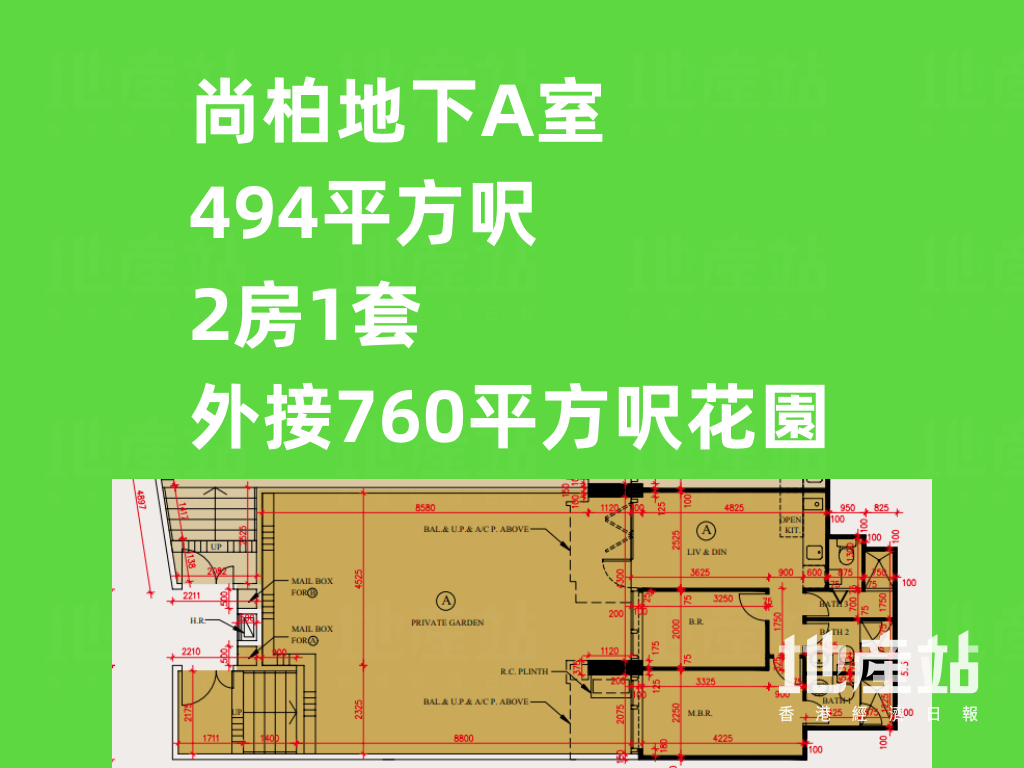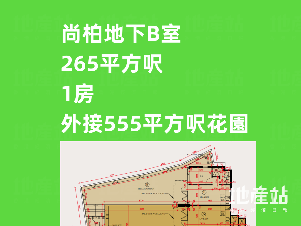 至於地下B室及1樓A室,實用面積同為265平方呎,均為純1房間隔,並列全盤面積最細的單位;兩者分別外接555平方呎花園,以及218平方呎平台。前者花園的面積比室內面積足足大1.1倍。