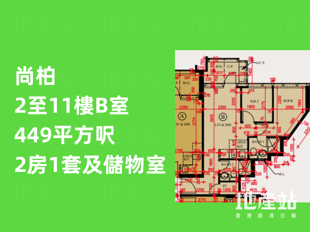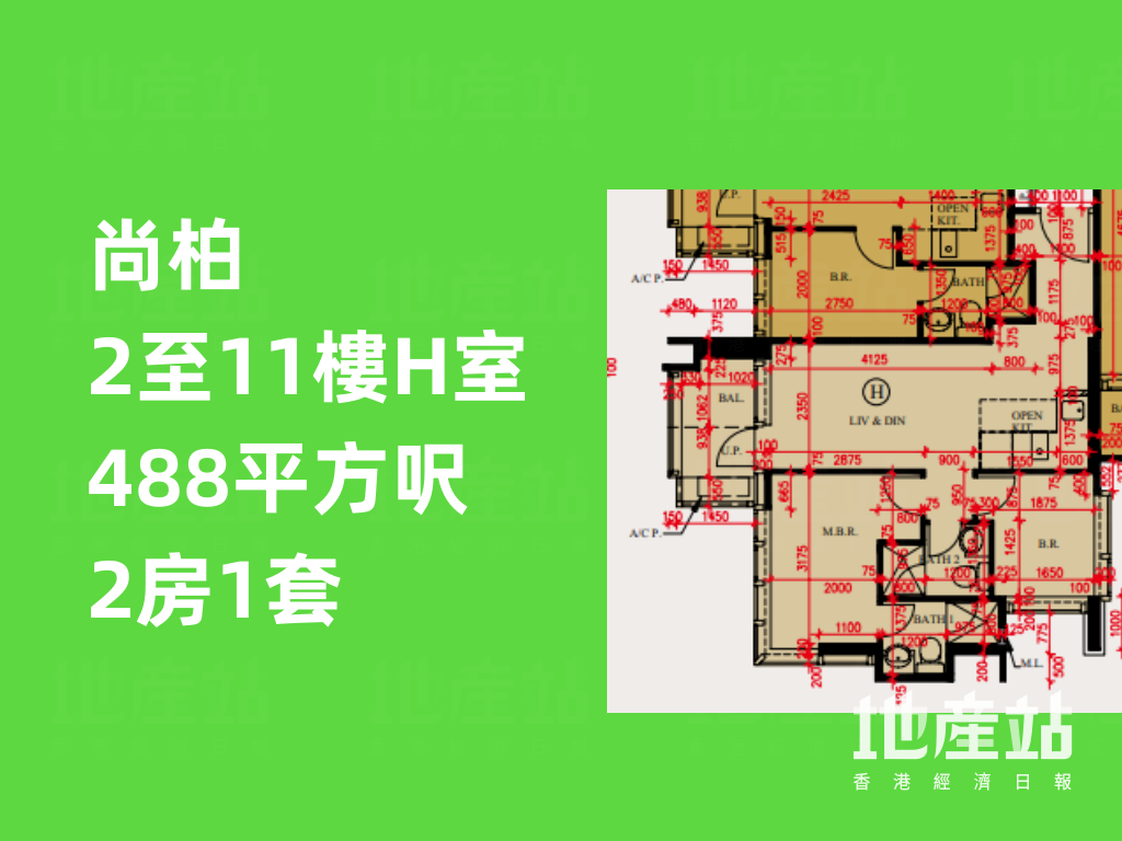 尚柏的2房戶均為2房1套設計,分布於2至11樓B及H室;當中B室設L形玄關,大門前設有儲物室,旁邊則為浴室;客飯兩廳則為日字形設計,外接「三合一」露台。開放式廚房位於飯廳一角,呈長形設計。兩間房間一字排開,與廳同向;當中主人房呈梯形開則,傢俬擺位上需要留意。