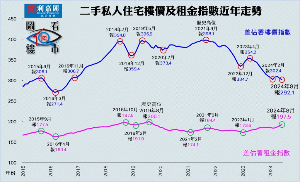 利嘉閣地產研究部主管陳海潮表示,樓價跌勢未止,後市減息效應尚待觀察,首階段料先帶動交投回暖,而樓價極其量只能減緩跌勢,要回升仍需其他經濟因素及條件配合才能實現。差估署今日公布的最新數據顯示,2024年8月份私人住宅售價指數報292.1點,較7月的297.2點續跌1.72%,已連跌4個月,累跌5.65%。樓價創下自2016年9月以來的96個月(即8年)新低。今年首8個月,樓價累積下跌了6.17%;若與2021年9月的歷史高位398.1點比較,樓價累積跌幅擴大至26.63%。