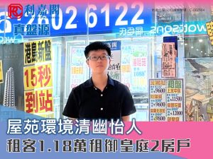 利嘉閣地產上水中心分行首席聯席董事黃靜顏(Yen)表示,該行高級客戶經理馬肇軒(John)最新促成上水御皇庭1座中層F室的二手租賃成交個案,單位實用面積約452方呎,屬2房間隔,向南,外望樓景。