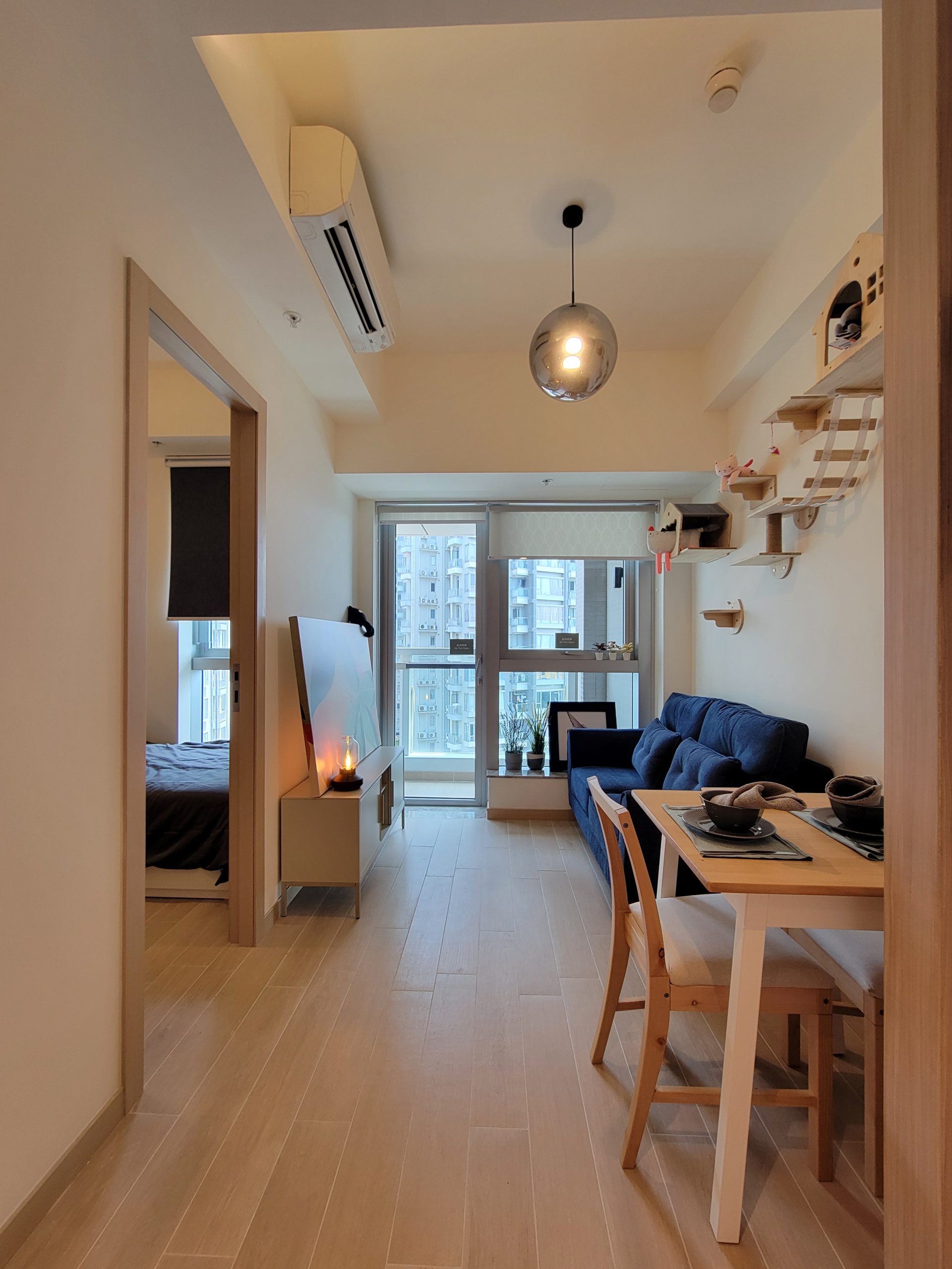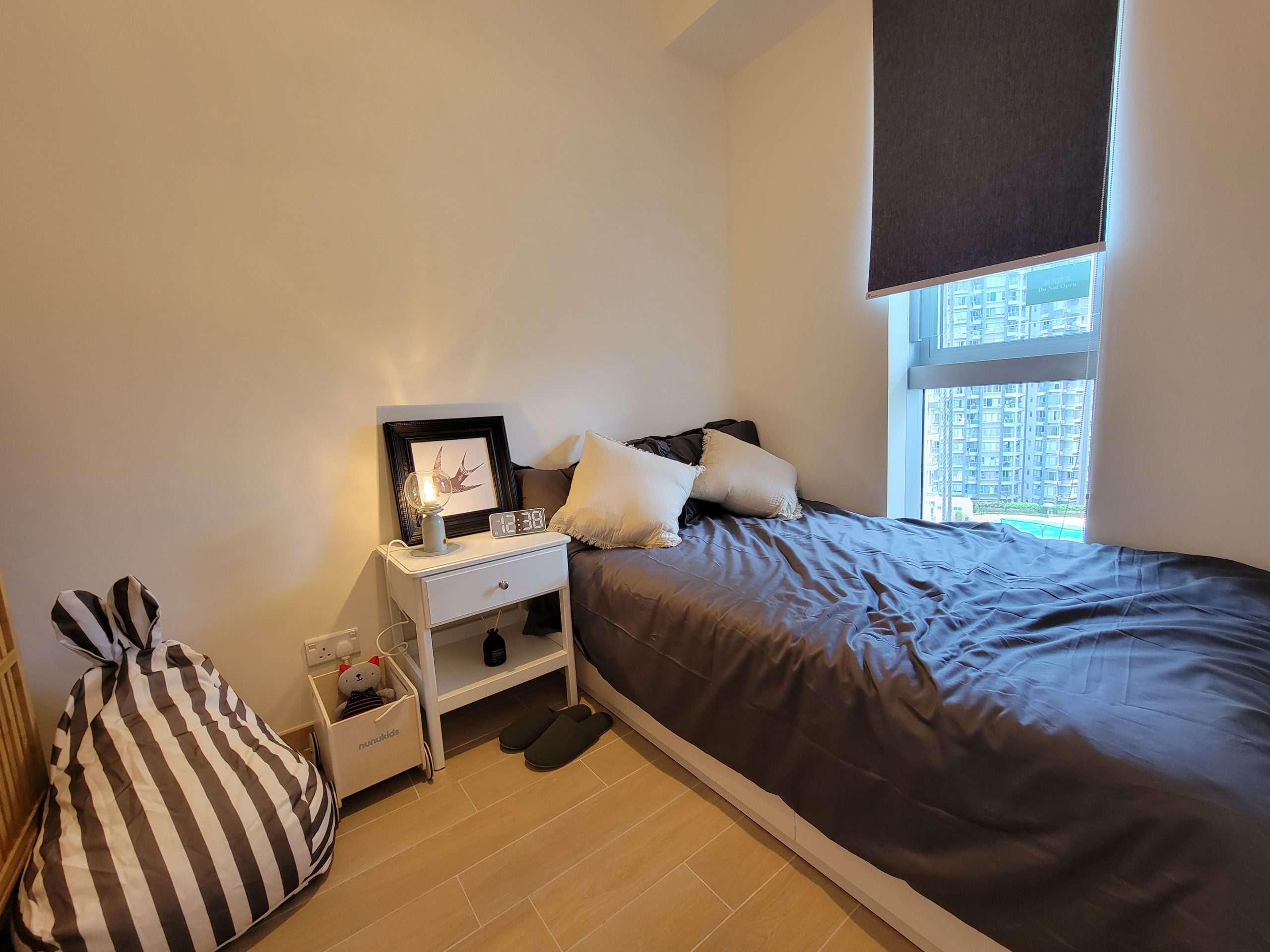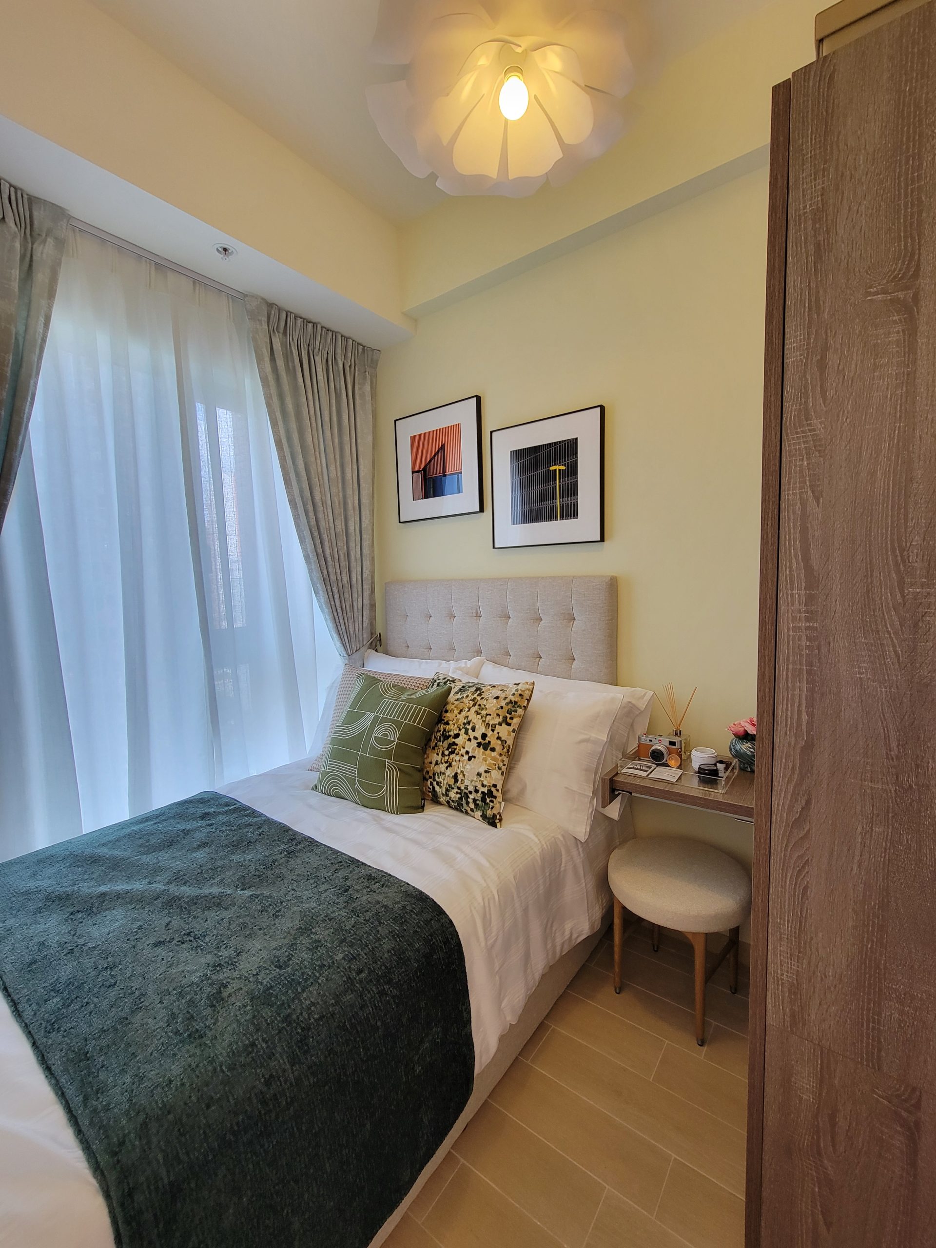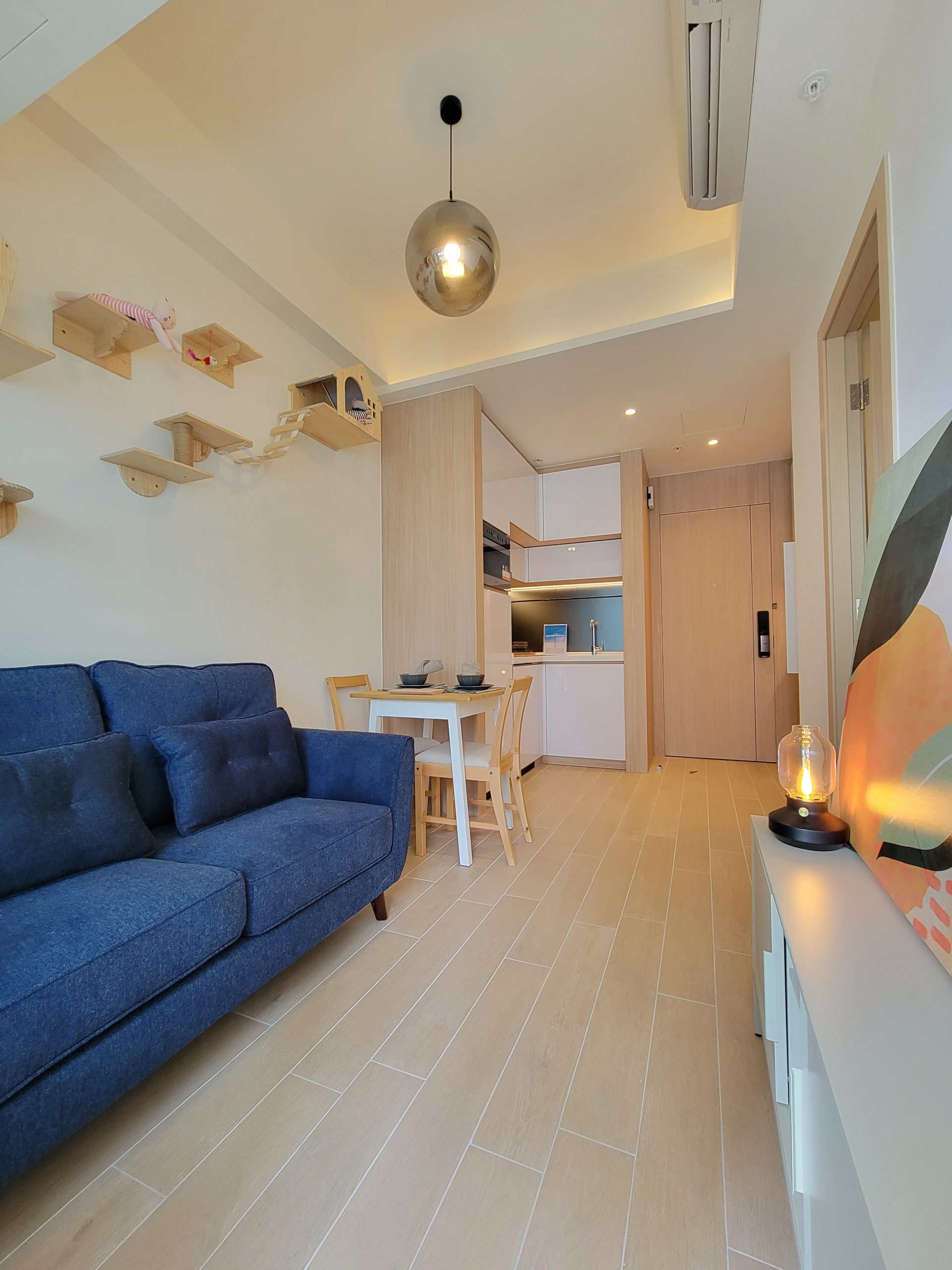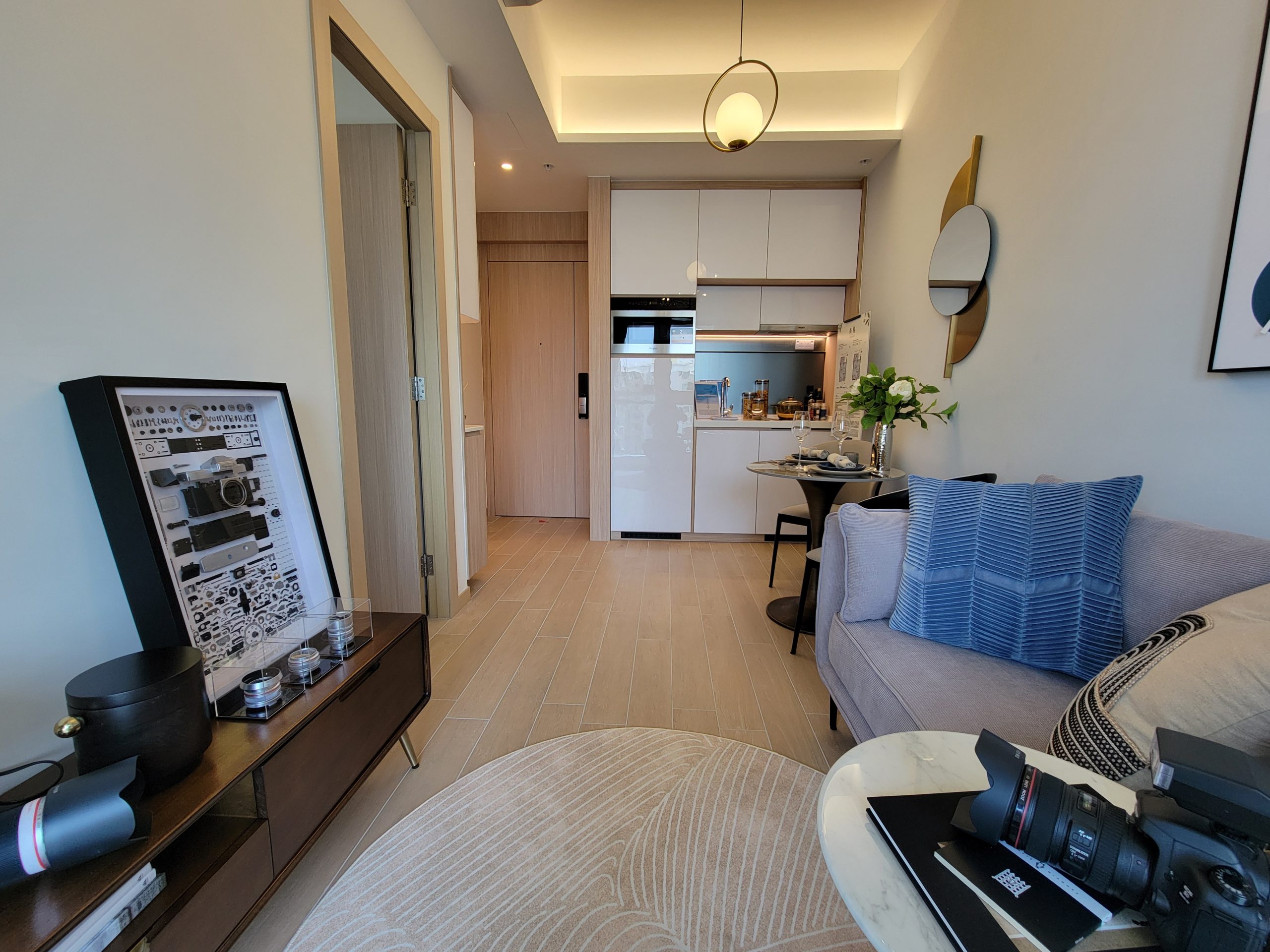 單位以莫蘭迪色系為主調,配以相機配件及雀鳥擺設作裝飾,突顯生活品味。放置傢俬後單位仍留有充足的空間,給予住戶小天地發展個人興趣及展出收藏品。