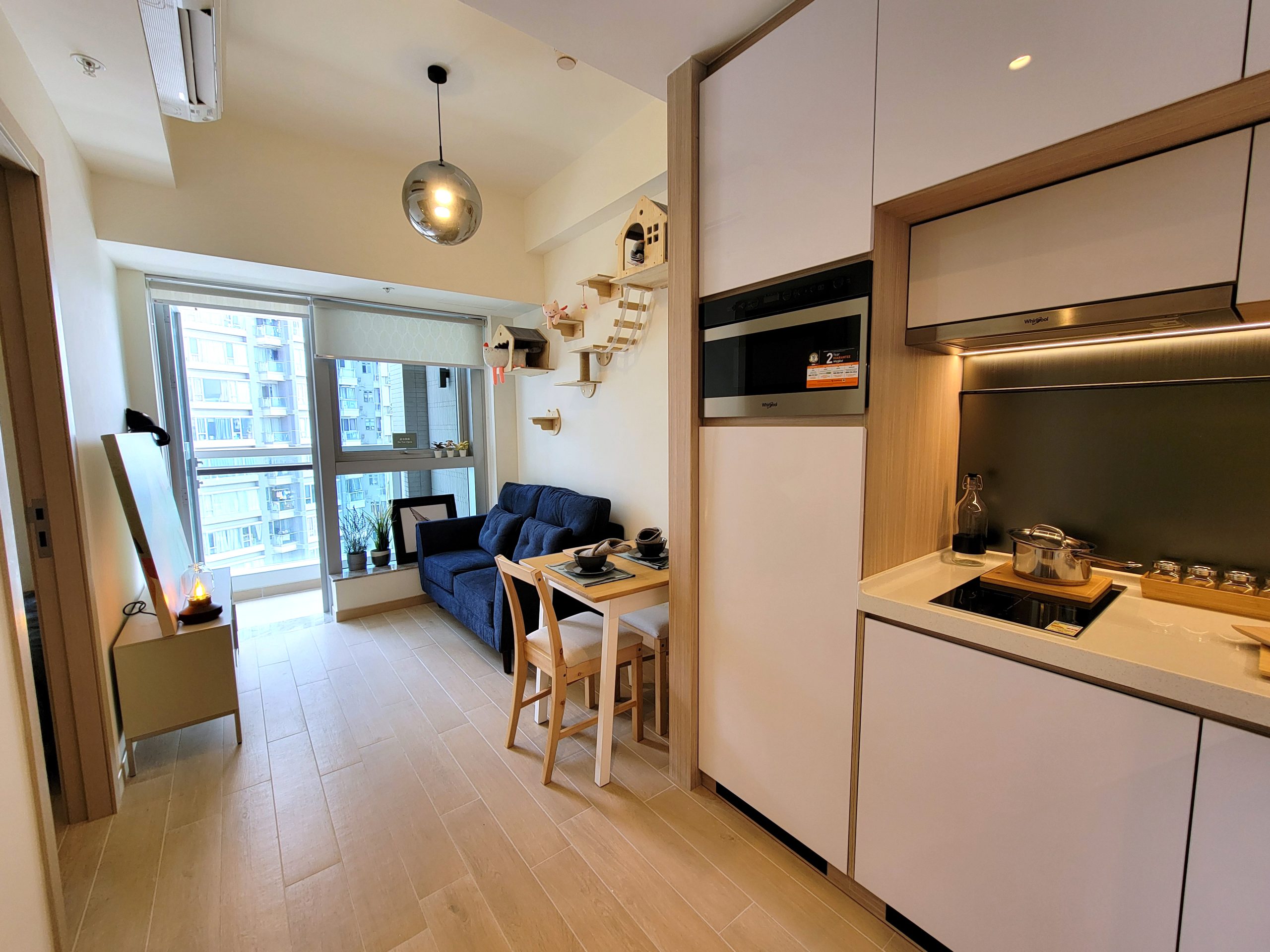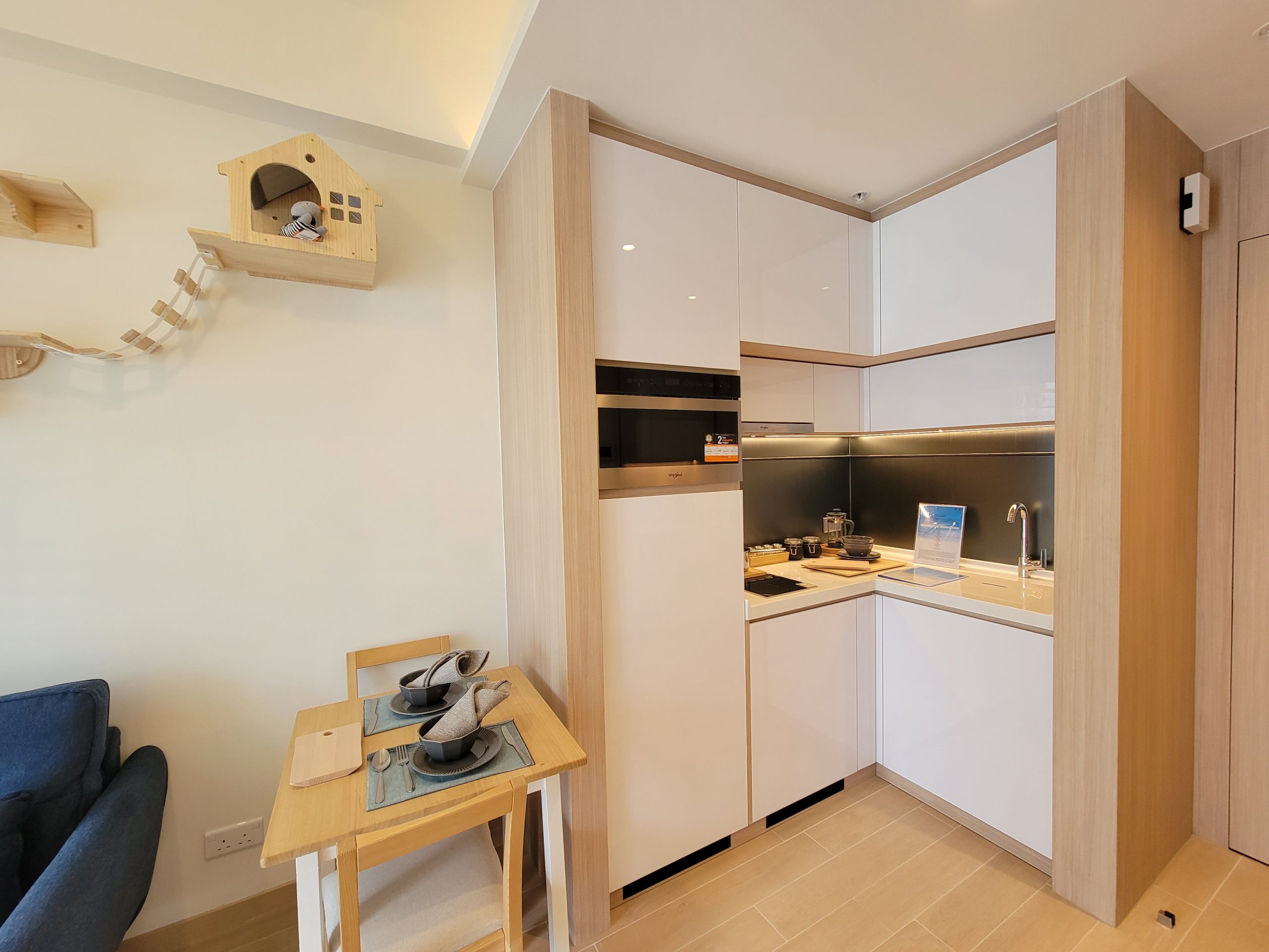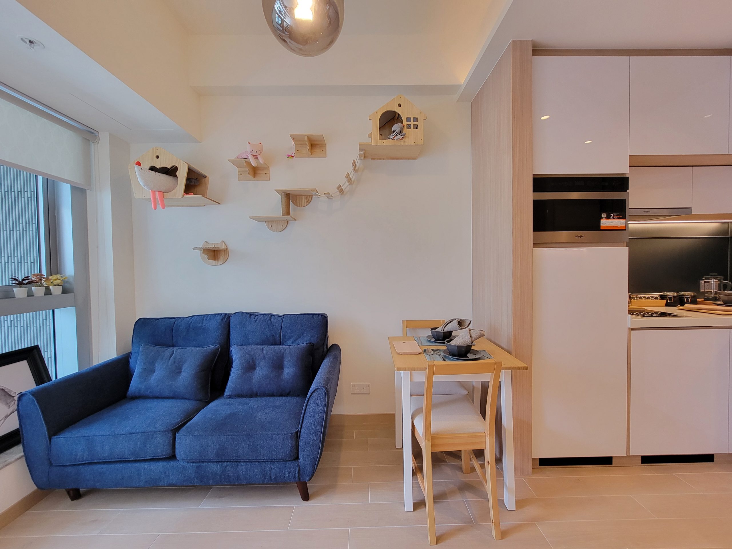 11樓A室「Momoland」,一房間隔,實用面積303方呎,開放式廚房已配備基本家電,如惠而浦雪櫃、煮食爐、抽油煙機、洗衣乾衣機及燒烤微波爐。客廳設有特大玻璃幕牆連接寬敞露台,坐享翠綠開揚山景。單位特別融入寵物元素,客廳牆身裝置貓爬架組合,令主人與寵物可共享舒適空間。
