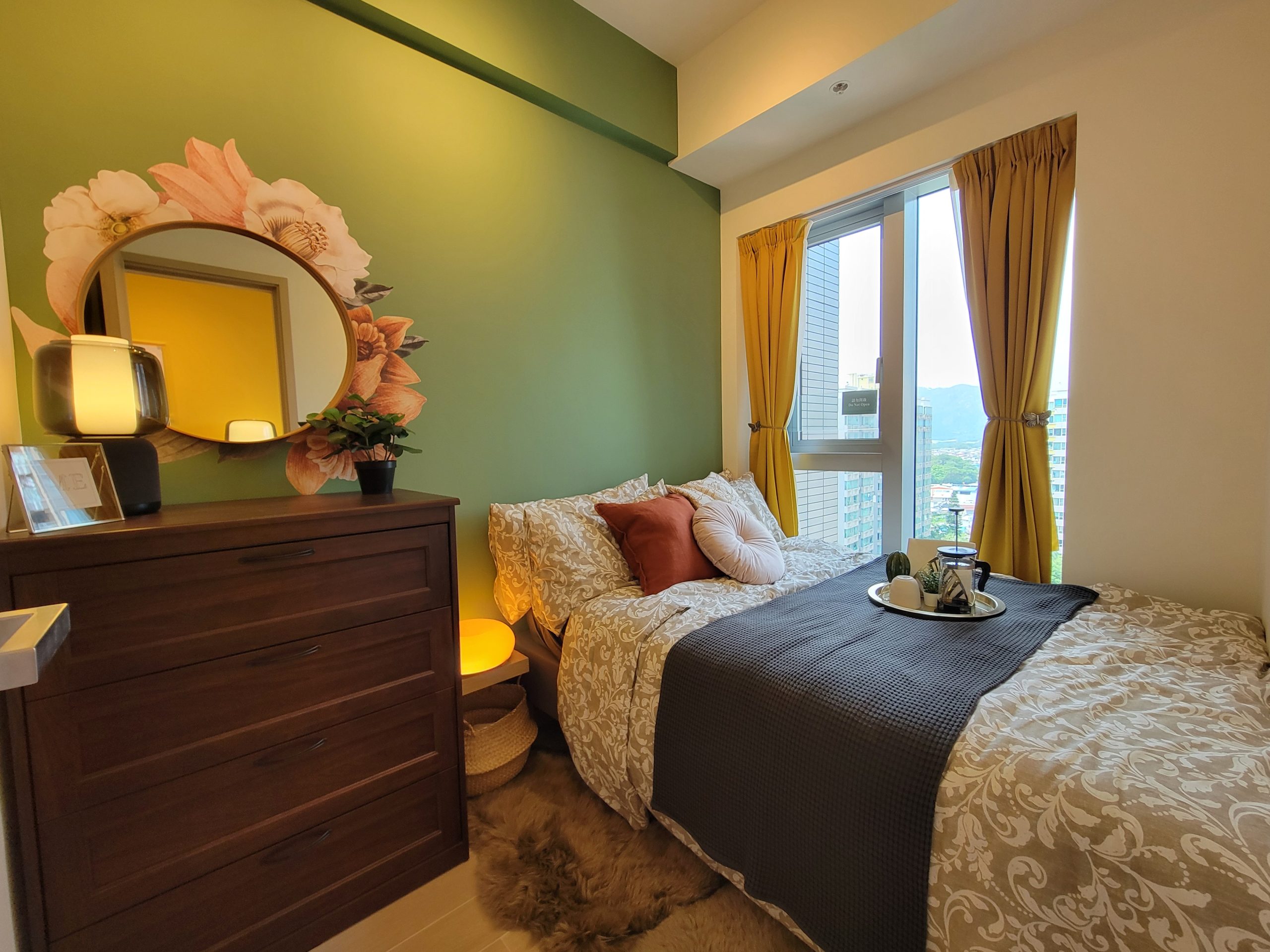 單位特別採用不同色調的牆身及傢俬配搭,鮮明地分隔開睡房與客廳的空間。設計師更加入色彩鮮艷的花及蝴蝶元素,與單位色調配搭相映相襯,獨具格調。