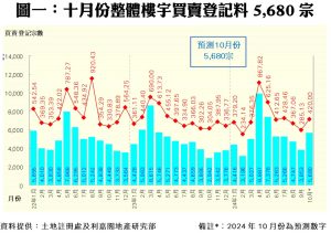陳海潮表示,本港跟隨美國提早落實減息0.25厘,令市場有驚喜,發展商亦隨即乘勢積極推盤,率先受惠的兩個新盤開售報捷,其餘新盤亦緊接應市,料本月一手登記有望大增,出現倍數式反彈。此外,受惠內地全方位救市,帶動本港股市急升,整體投資市場氣氛高漲,均有利二手住宅及工商舖等板塊同步回暖。初步預期,十月份整體樓宇買賣登記量有機會一舉重越五千宗以上,按月料大升近五成,上試5,680宗,屆時有機會創5個月高位,一洗近月頹勢。