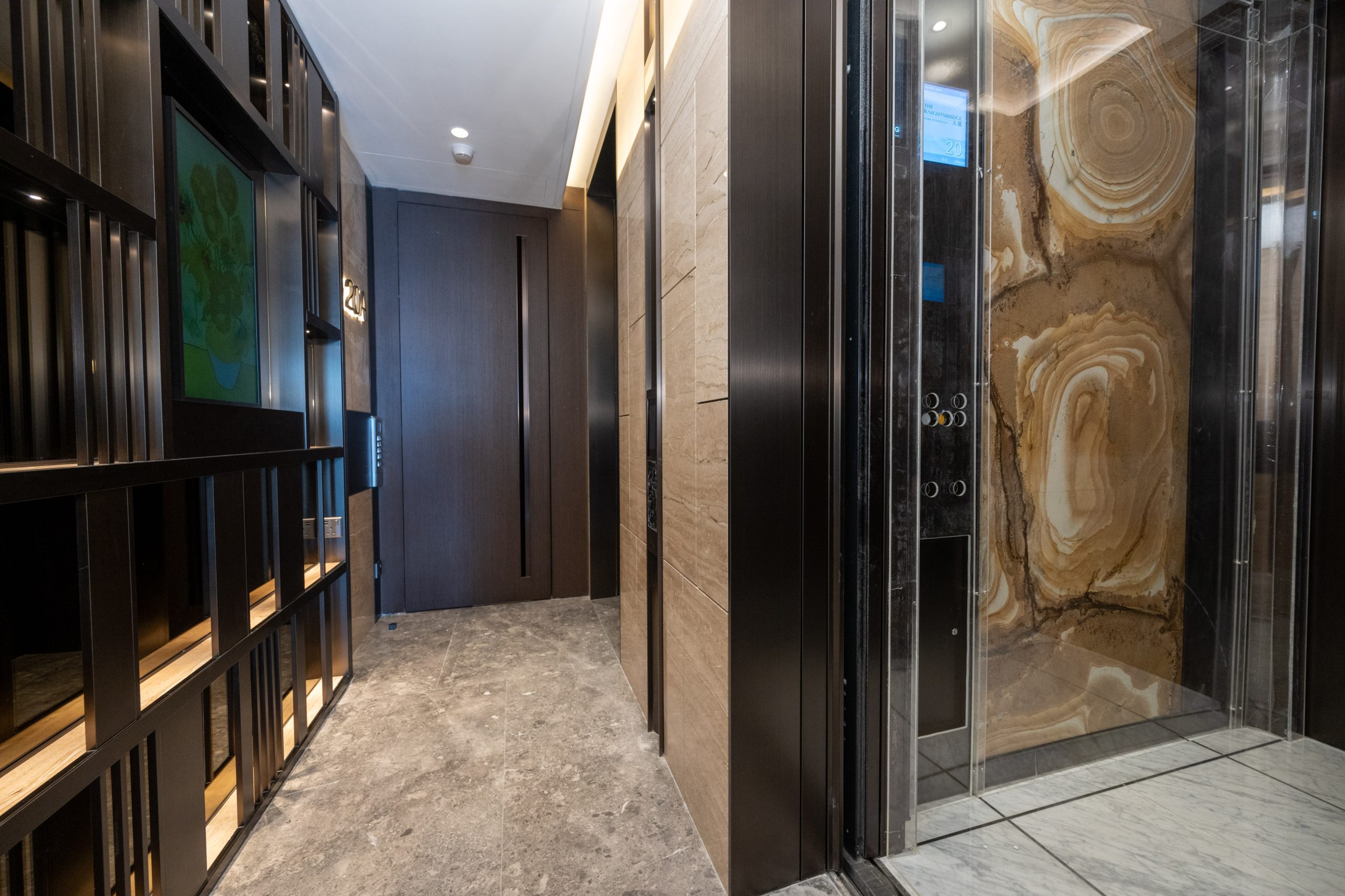 「天瀧」第3座20樓B室連裝修現樓單位,實用面積1,085方呎,屬於三房一套連儲物房間隔,層與層之間高度約3.3米。由知名室內設計公司Kira Design所設計,以法國著名奢侈品牌為靈感,將經典元素巧妙地融入設計,並透過橙、金和啡色的典雅配色,打造貴氣時尚的生活空間。單位設有私人電梯大堂,住戶可利用八達通或手機App乘專屬電梯直達,私隱程度高。 私人電梯大堂更設有 Samsung The Frame 32吋自訂畫框電視,可建立私人藝術畫廊,盡顯鉅宅氣派。