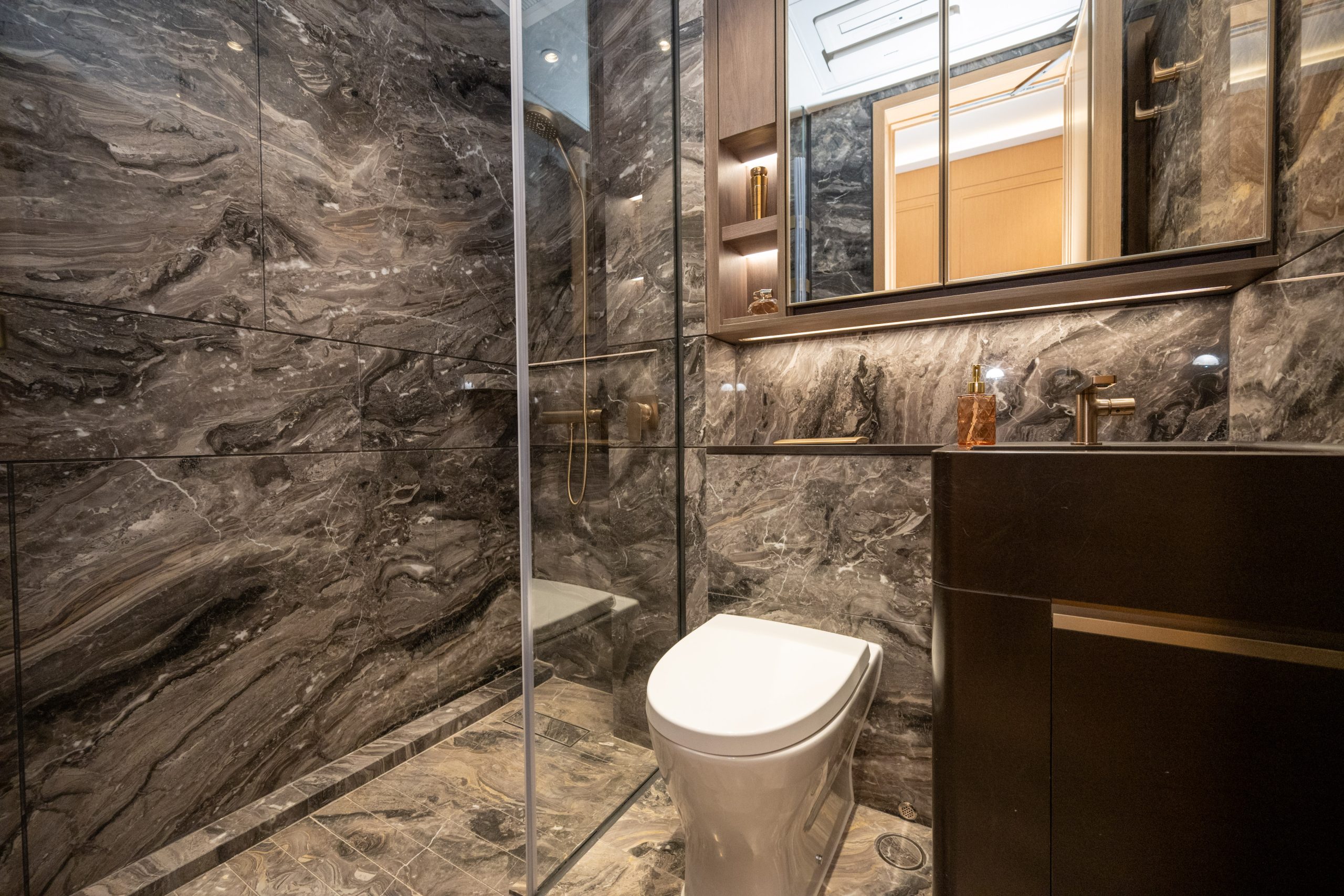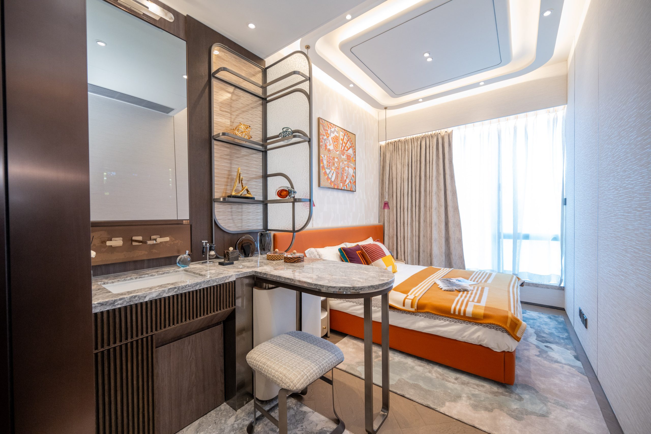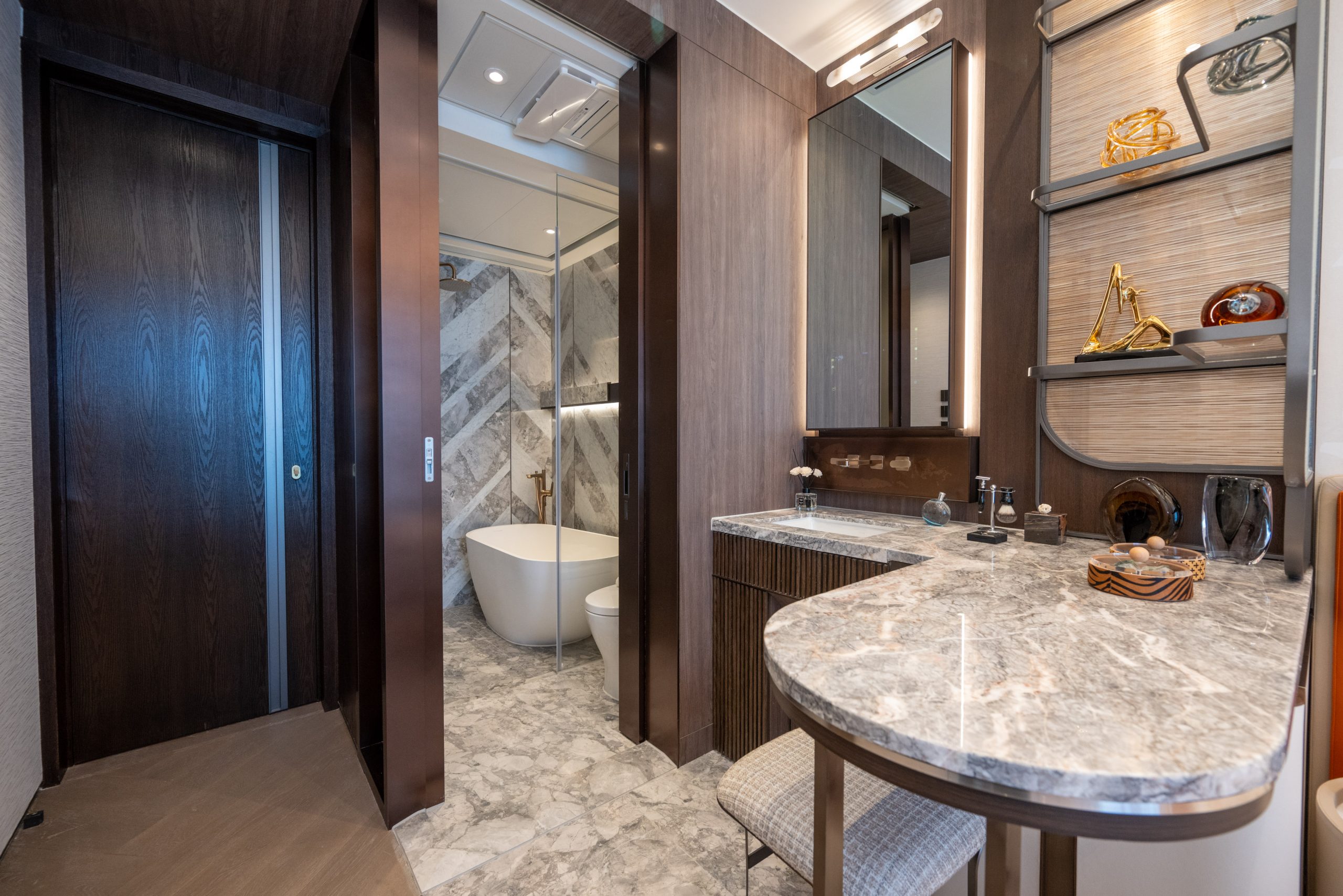 三間睡房都間隔方正,寬敞實用。主人睡房放置雙人床後仍可三邊落床,空間十足,配備意大利Poliform雙面Display Closet,分隔主人睡房與衛浴空間,營造空間流動感。單位更精選英國Claybrook獨立浴缸、美國衛浴品牌Kohler、意大利Cristal化妝品雪櫃及HKT Smart Mirror等,昇華生活品味。