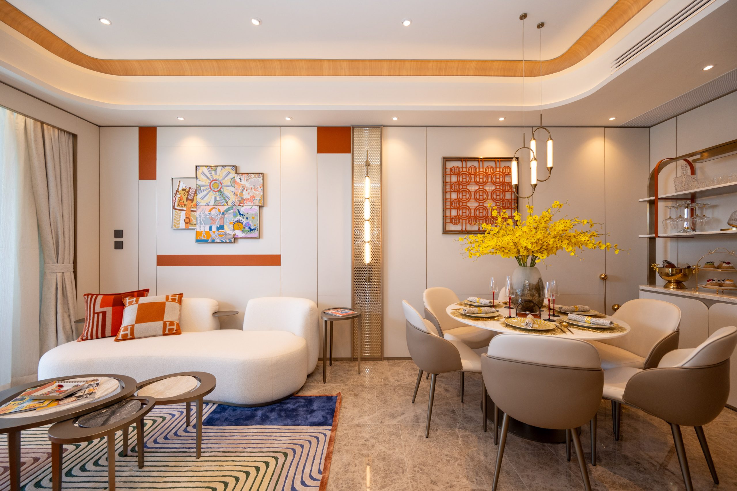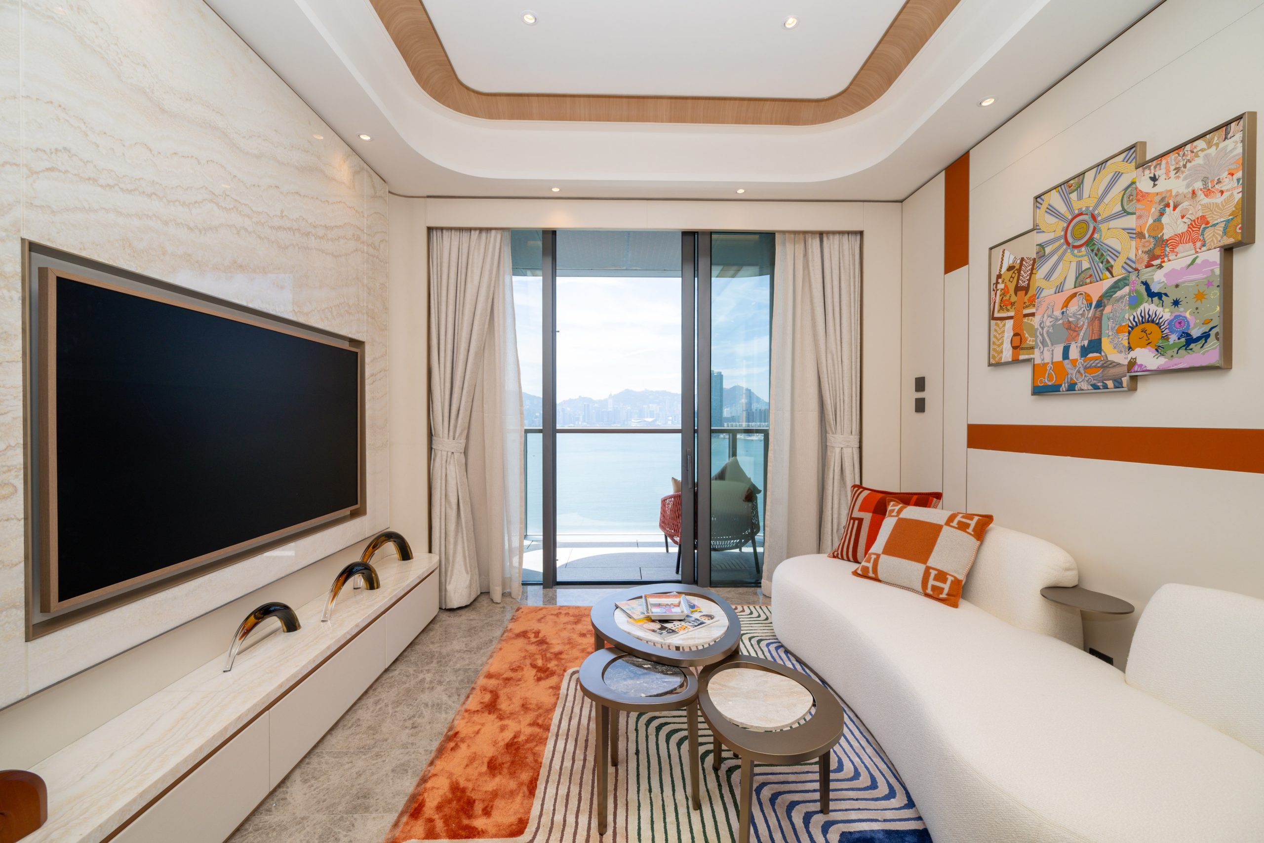 客飯廳長約6.5米、闊逾3.3米,間隔方正實用,布局分明。設計以米色及金色為主,設6人圓餐桌及米白色沙發,配以特色牆及經典奢華絲巾作裝飾,營造出精緻時尚的生活氛圍。全落地玻璃趟門接連逾3.1米闊的啞金色流線型露台,除了將自然光引入室內,更可晝夜鑑賞世界級環迴維港雋景。三間睡房都間隔方正,寬敞實用,並以經典奢侈品牌產品作點綴,時尚美觀。主人睡房放 置雙人床後仍可三邊落床,空間十足。主人睡房選用馬銜形狀的特色床頭燈,馬銜設計元 素亦延伸至衣帽間,實用與美感兼備。單位更精選意大利Poliform Display Closet、英國Claybrook獨立浴缸、美國衛浴品牌Kohler、意大利Cristal化妝品雪櫃及HKT Smart Mirror等,昇華生活品味。