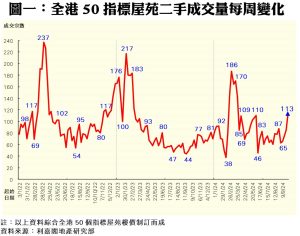 利嘉閣地產研究部主管陳海潮表示,本地減息兼逢中央救市效應顯現,樓市氣氛同告好轉,入市意欲隨即大增,帶動過去一周指標屋苑交投顯著上升。綜合利嘉閣地產分行數據所得,全港50個指標屋苑於上周(30/9—6/10)共錄113宗買賣個案,較前周(23/9—29/9)的85宗增加33%,不但是近四個月以來首度突破一百宗水平,更創自今年四月初以來的二十七周(逾六個月)新高。