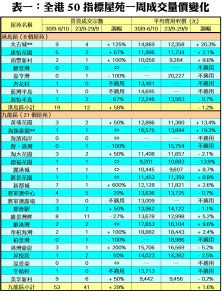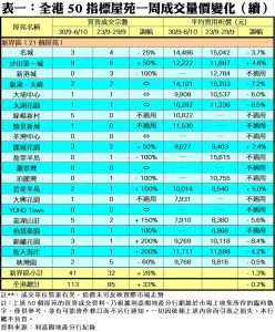 至於,新界區21個指標屋苑上周共錄41宗交投,較前周的32宗增加28%,當中錦繡花園及藍天海岸分別錄得3宗買賣,各自按周增加2倍;嘉湖山莊交投量由前周的2宗,增加1.5倍至上周的5宗;碧堤半島期內錄得2宗成交,較前周的1宗增加1倍;沙田第一城及麗城花園分別錄得9宗及3宗買賣,按周各自增加50%。此外,在全港50個指標屋苑之中,上周共有13個屋苑錄得「零成交」,與前周的數字相同,當中新界區及九龍區分別佔4個及7個屋苑,港島區則佔2個(詳見表一)。