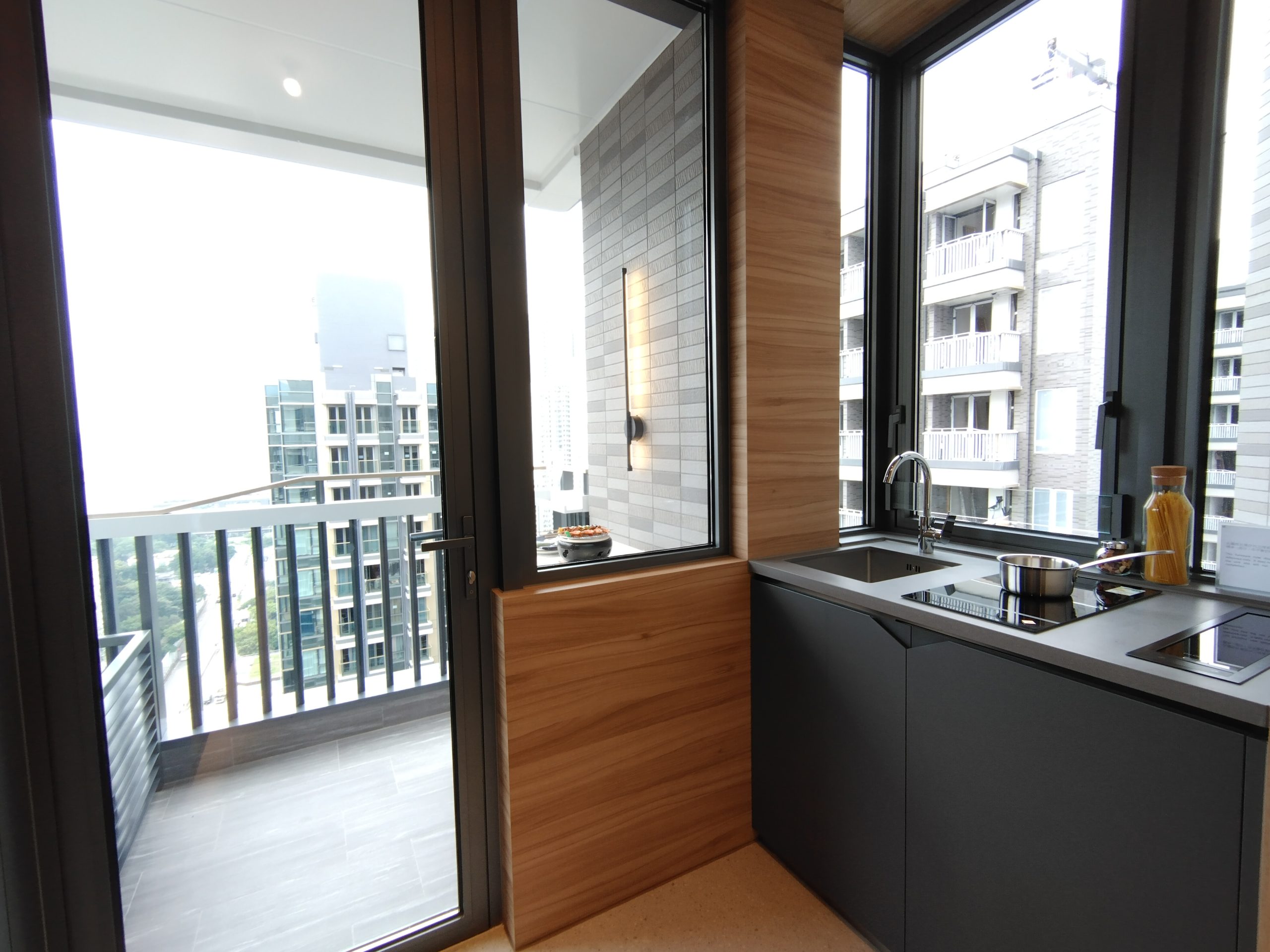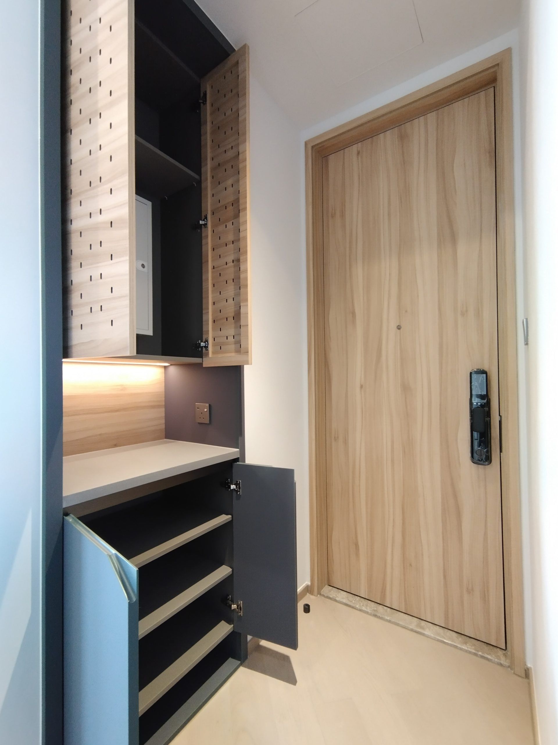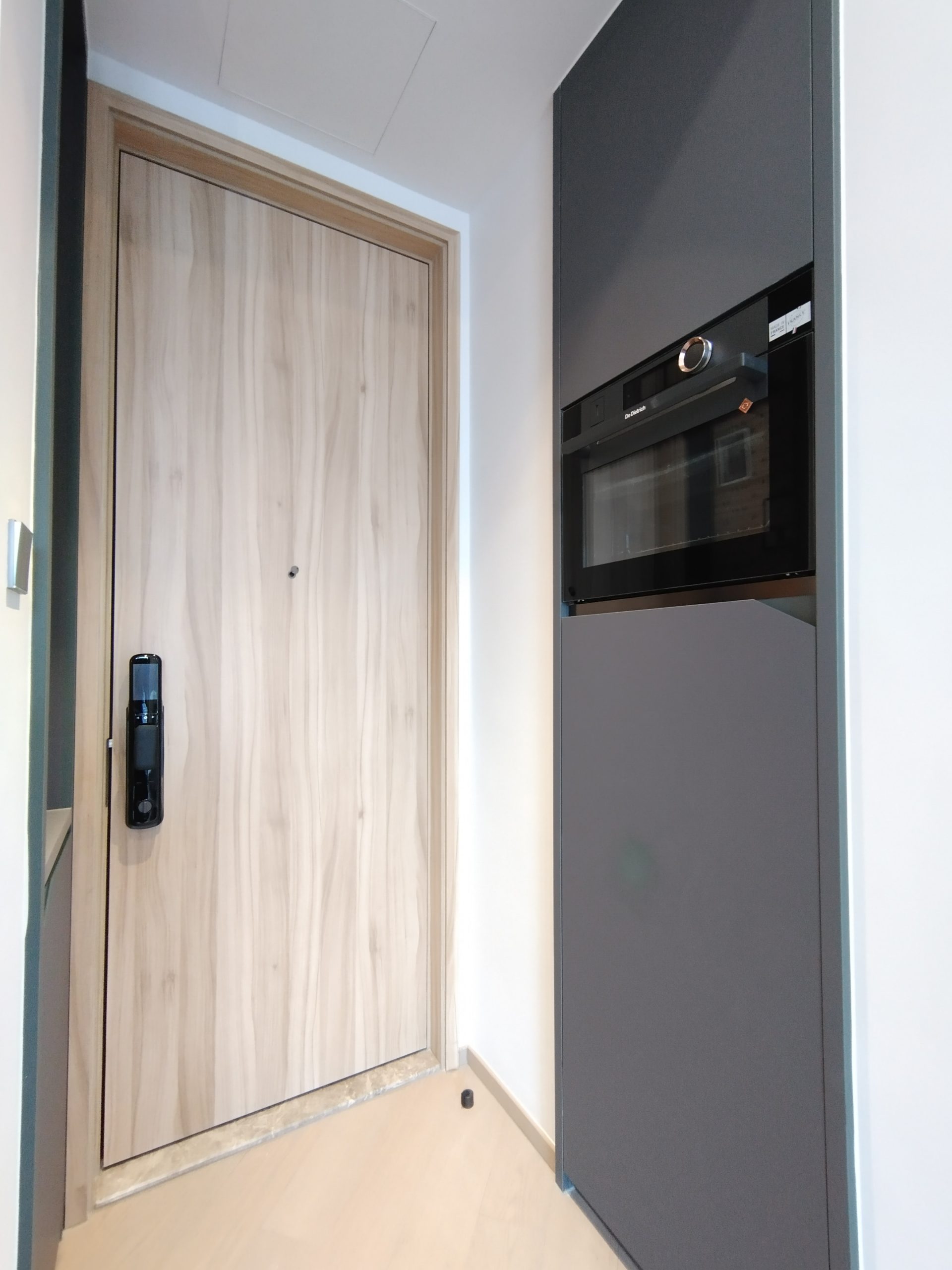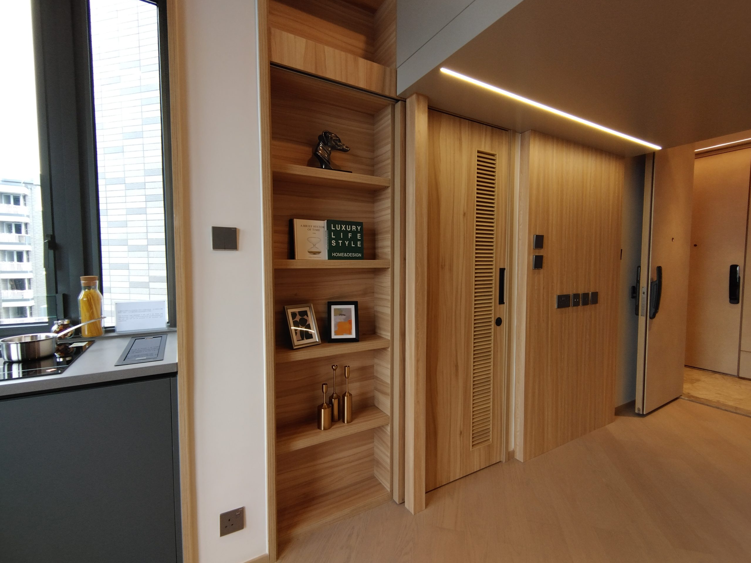 單位玄關附設鞋櫃,鞋櫃上方配置創意門板,讓住戶按個人喜好DIY擺放裝飾及物品,單位亦配備嵌入式由地面至天花的高櫃,增加收納空間;浴室設有窗戶,增加採光及加強通風,浴室趟門旁設有特色收納層架,既實用又能打造精緻生活氛圍;開放式廚房採用De Dietrich枱面式抽油煙機,有效善用廚房空間,及讓煮食爐前方的窗戶不受遮擋,有效提升室內採光度。