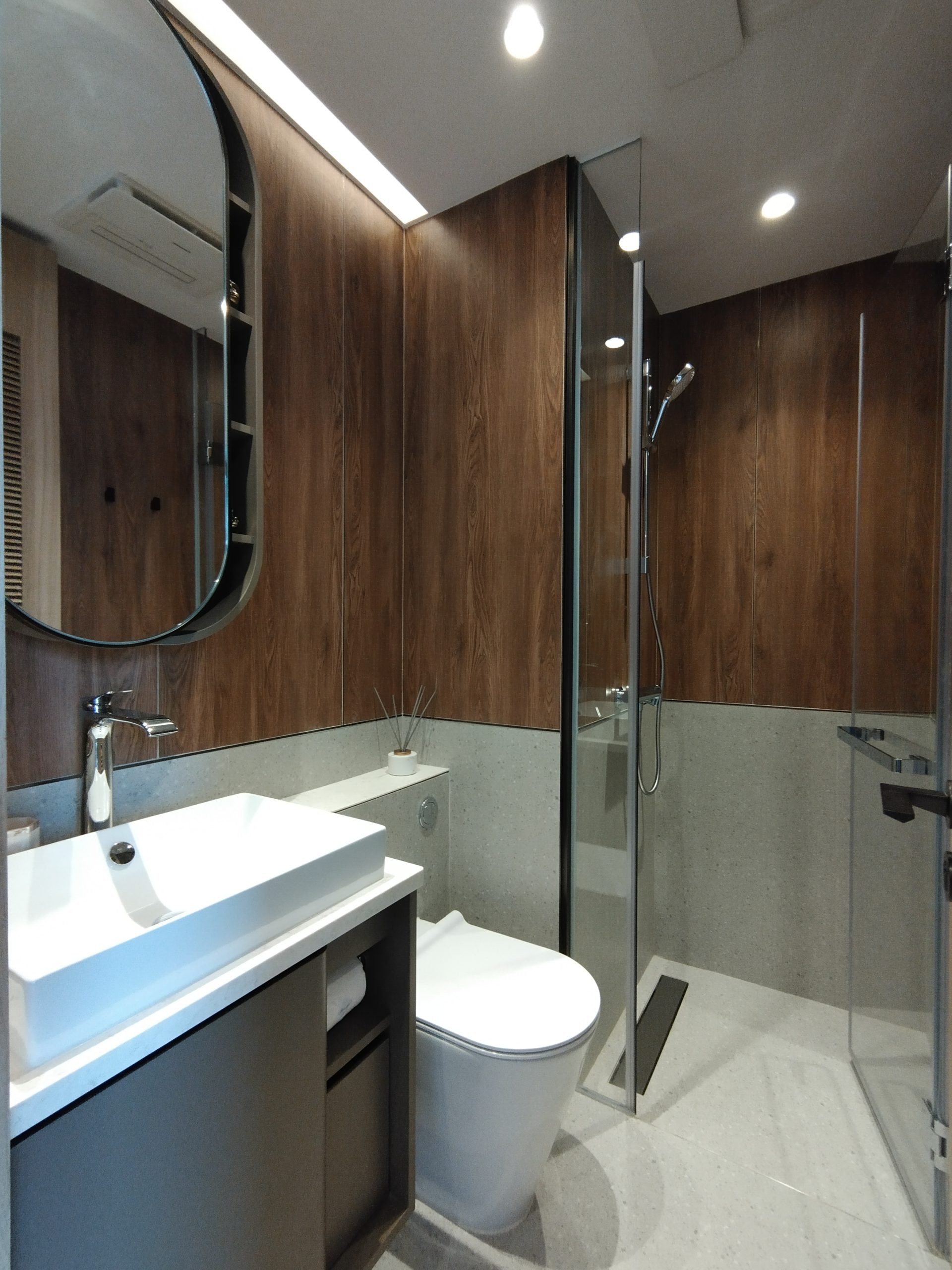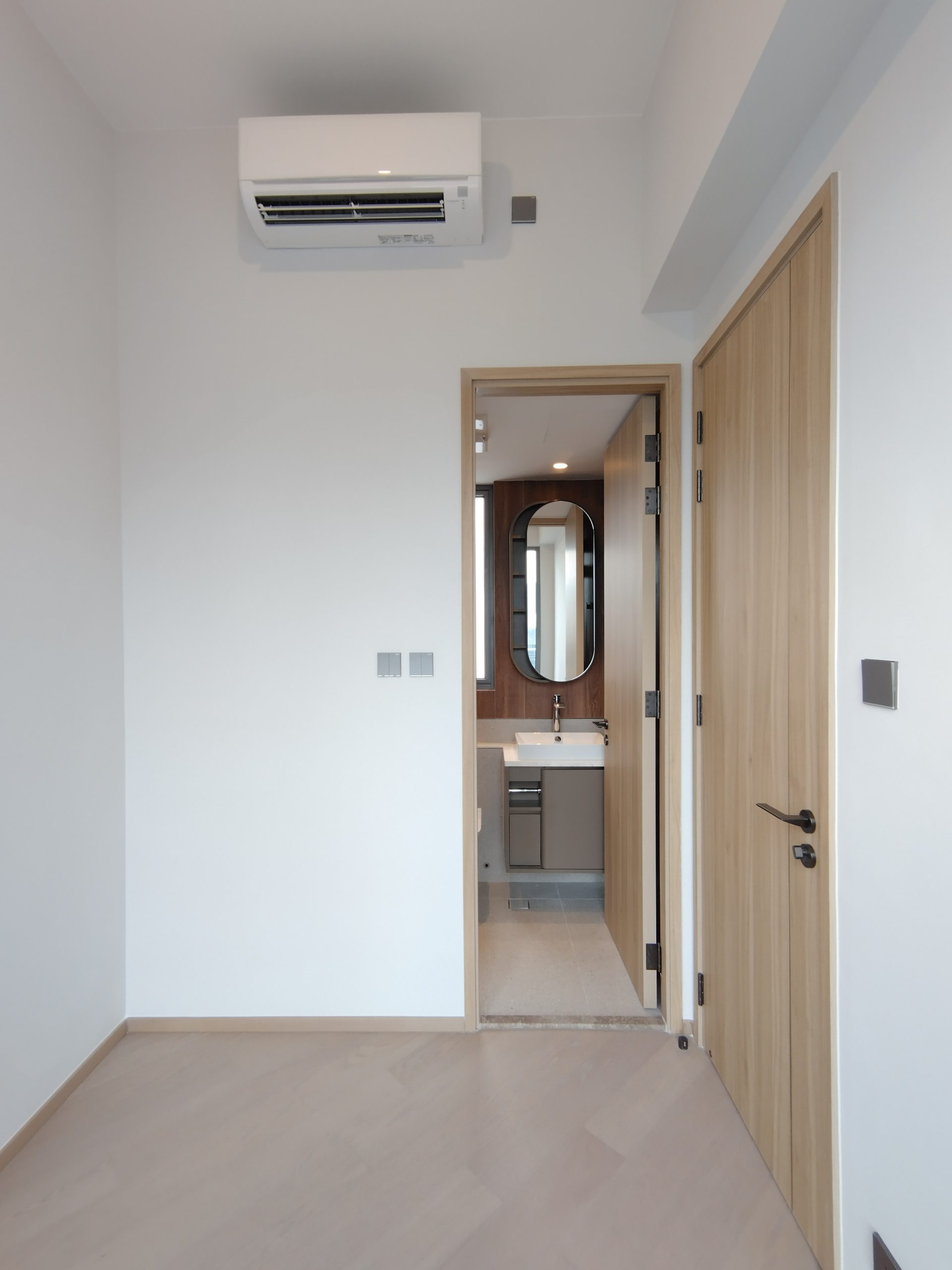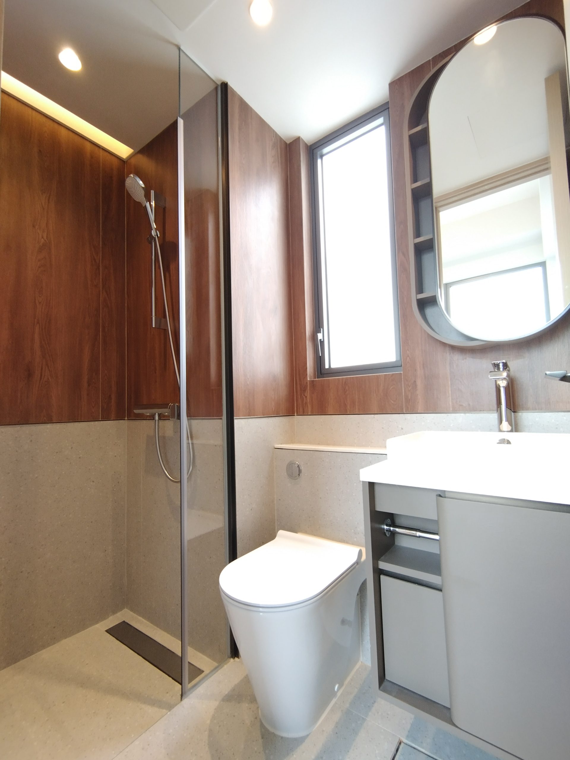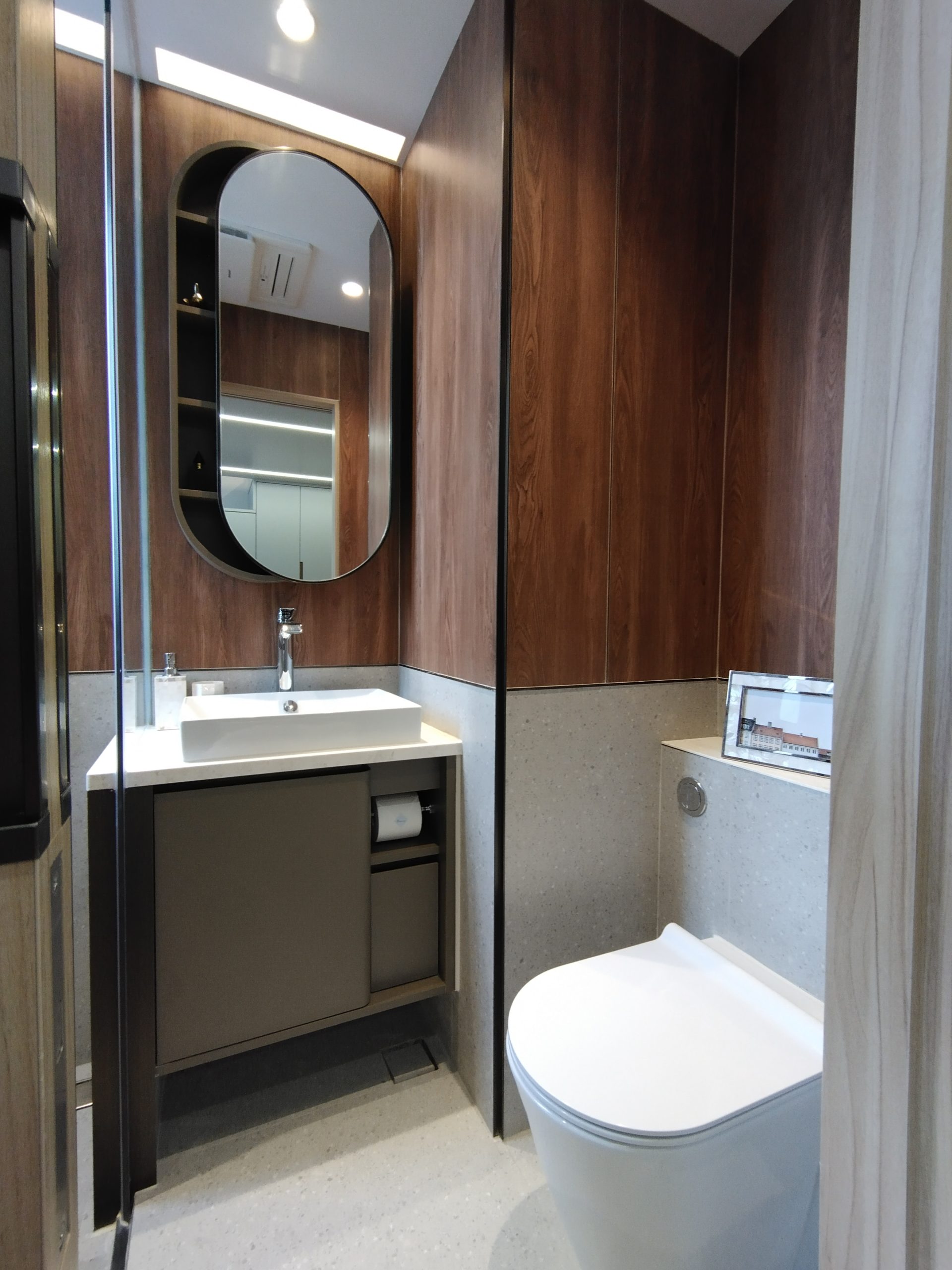單位玄關附設鞋櫃,鞋櫃上方配置創意門板,讓住戶按個人喜好DIY擺放裝飾及物品,單位亦配備嵌入式由地面至天花的高櫃,增加收納空間;浴室設有窗戶,增加採光及加強通風,浴室趟門旁設有特色收納層架,既實用又能打造精緻生活氛圍;開放式廚房採用De Dietrich枱面式抽油煙機,有效善用廚房空間,及讓煮食爐前方的窗戶不受遮擋,有效提升室內採光度。