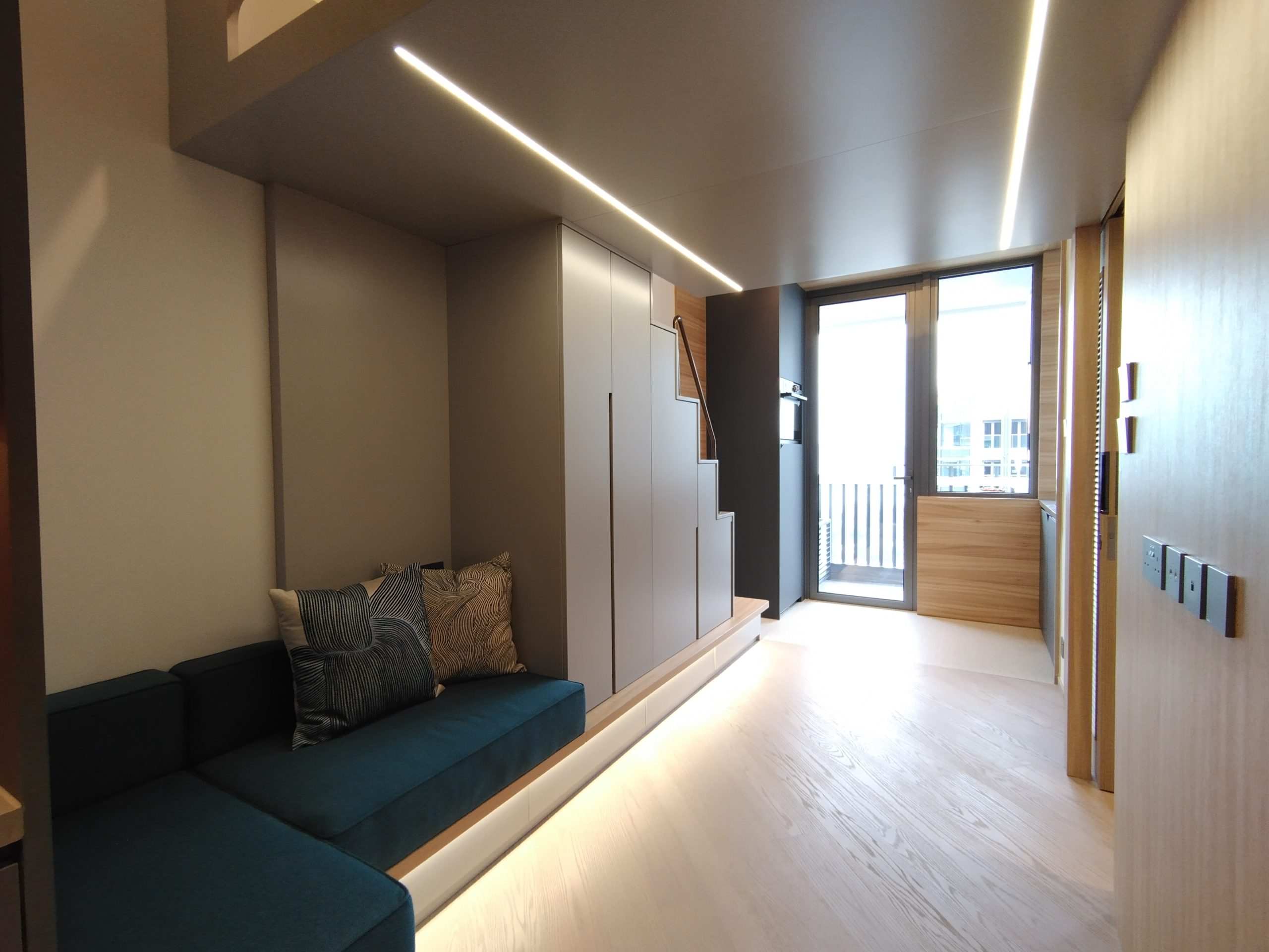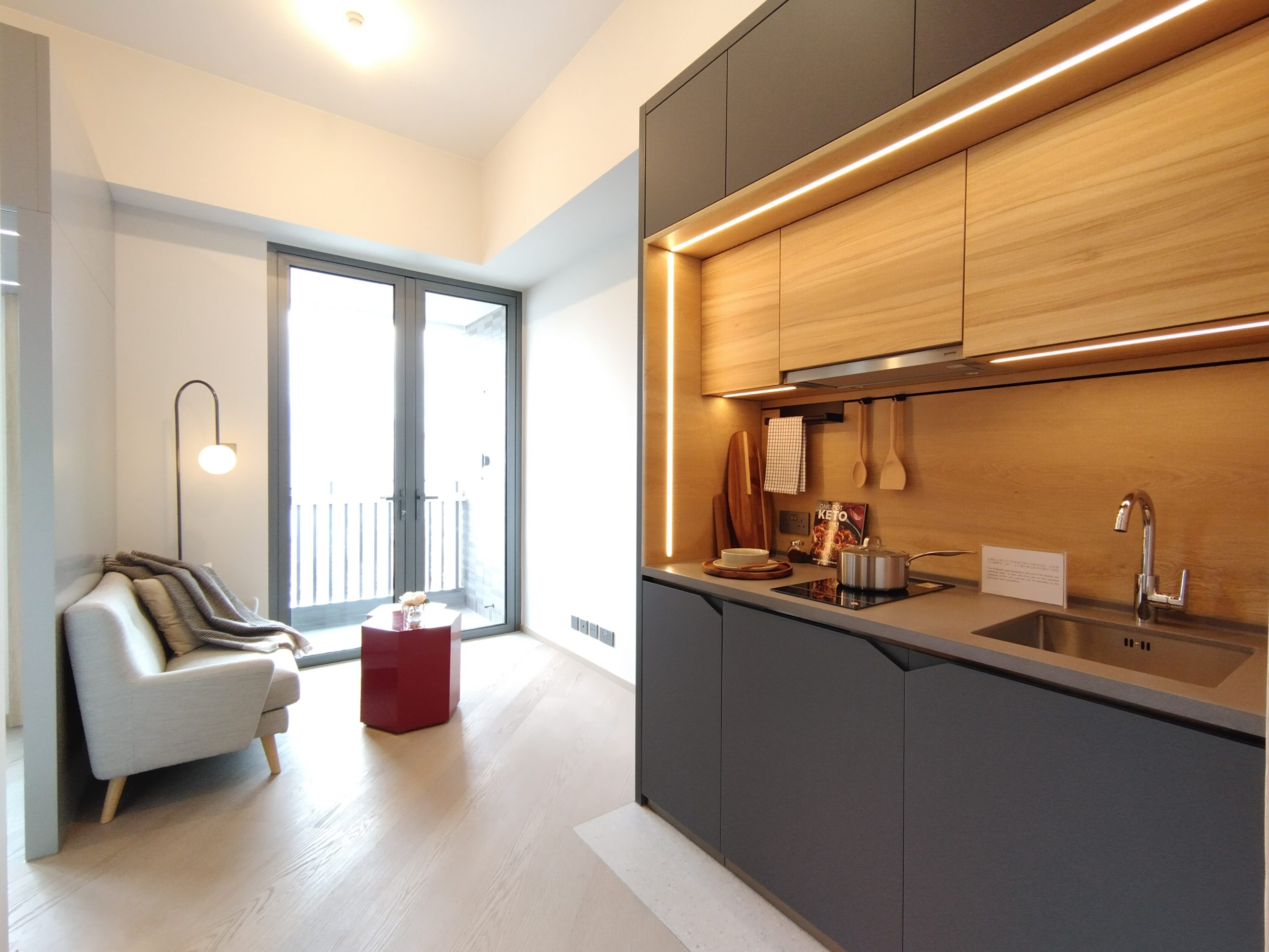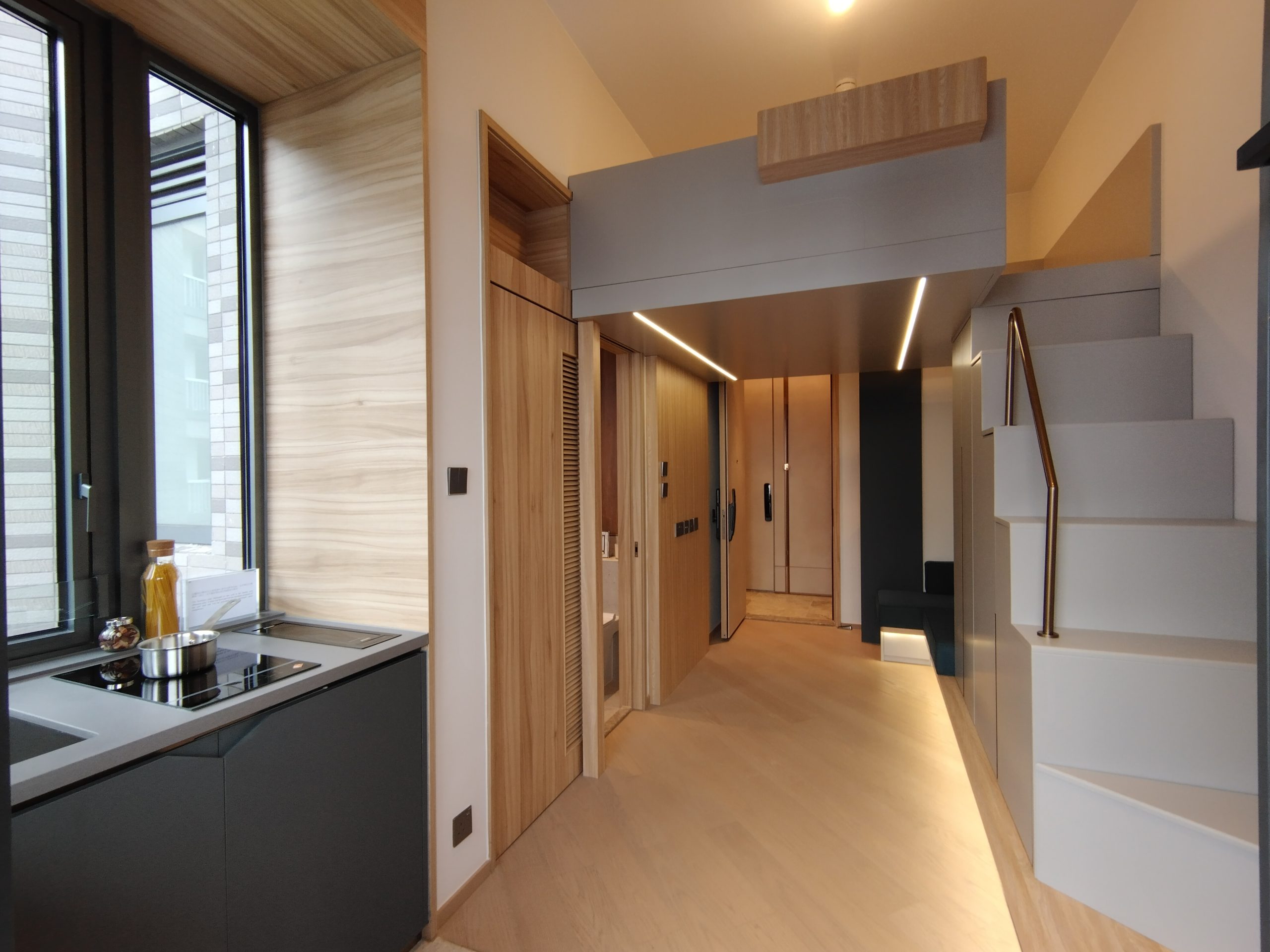 Studio Plus設有度身訂造的一體式家具,明顯分隔寢區、工作間及廳區,擴闊工作空間;一體式傢俱上方為寢區,下方以趟門式設計打造多功能空間,亦可放置書枱及衣櫃成為工作間及衣帽間。樓梯內設有收納櫃,令每處空間用得其所;開放式廚房配備法國品牌De Dietrich的電磁爐、蒸焗爐、歐洲品牌Gorenje抽油煙機。特色廚櫃採用優雅Vert Cypress墨綠色系櫃門,增加室內時尚風格。