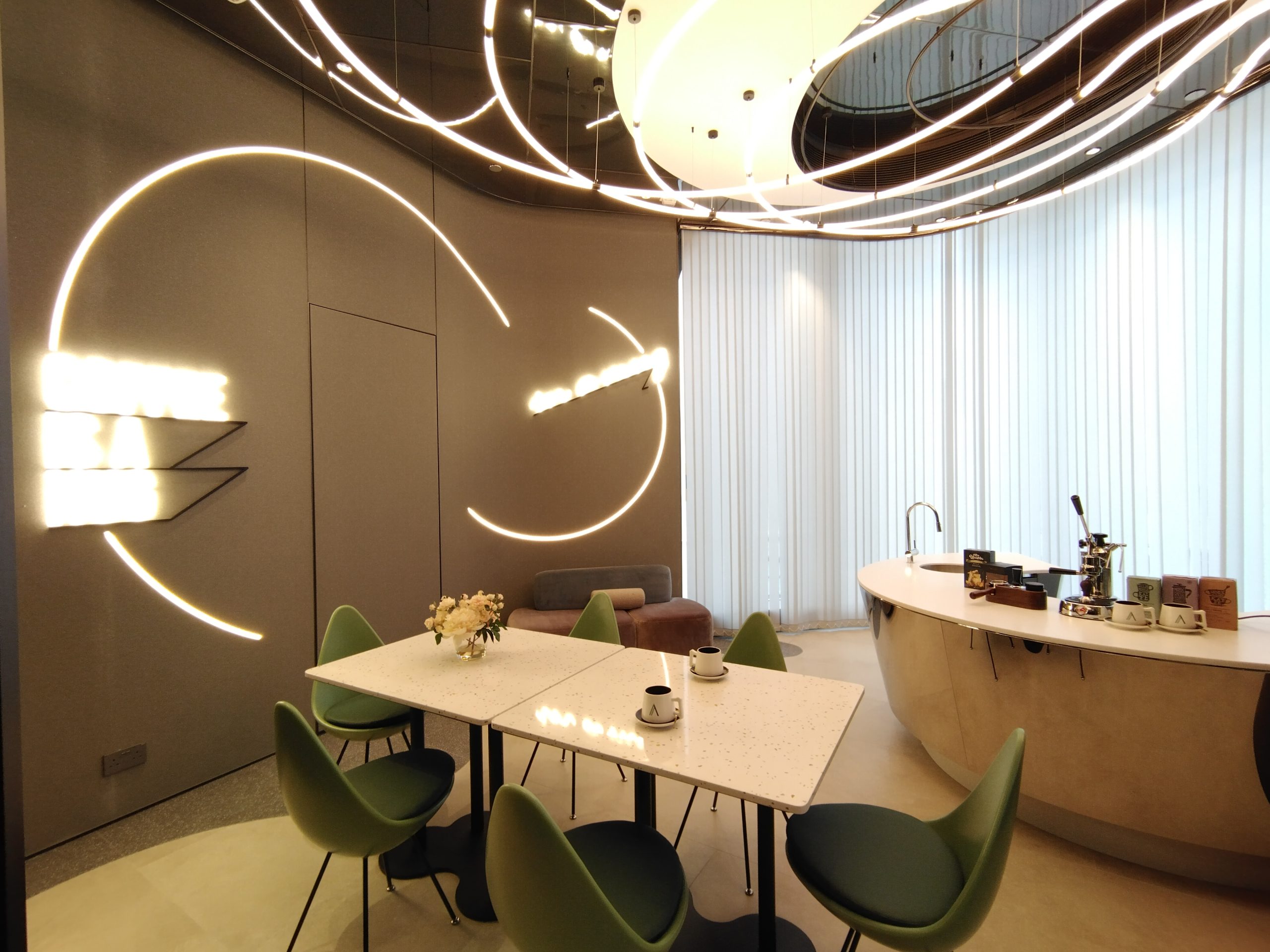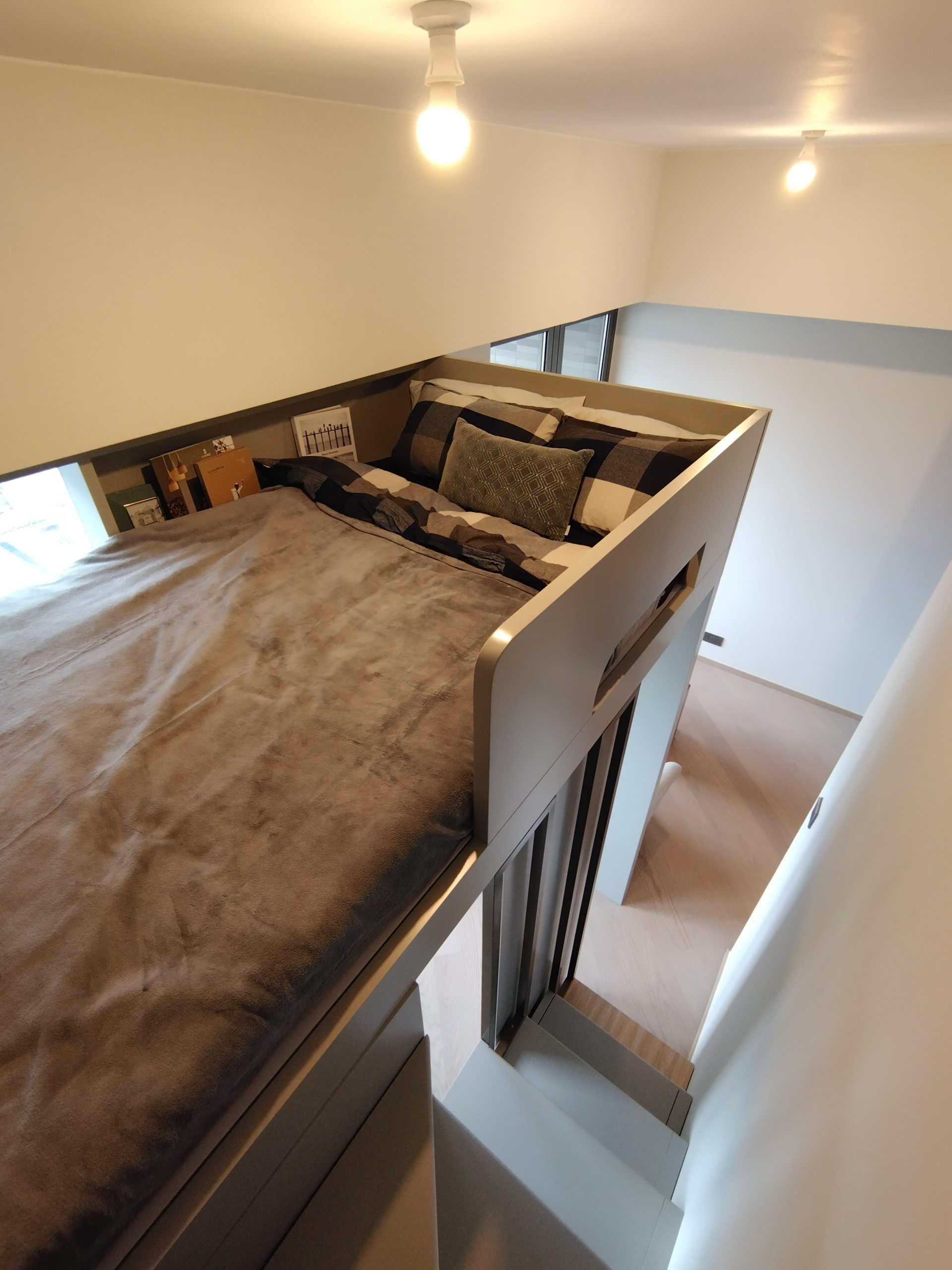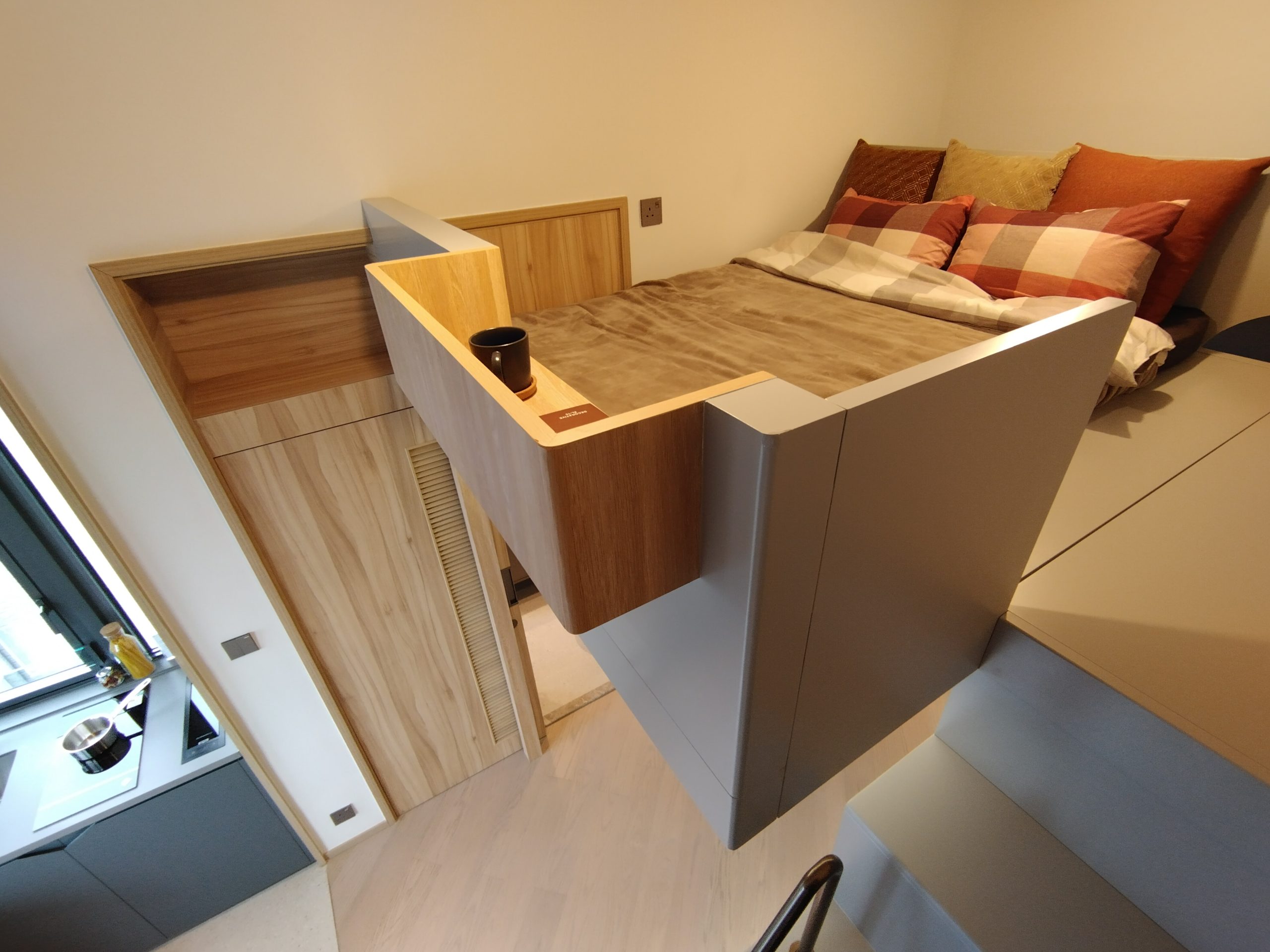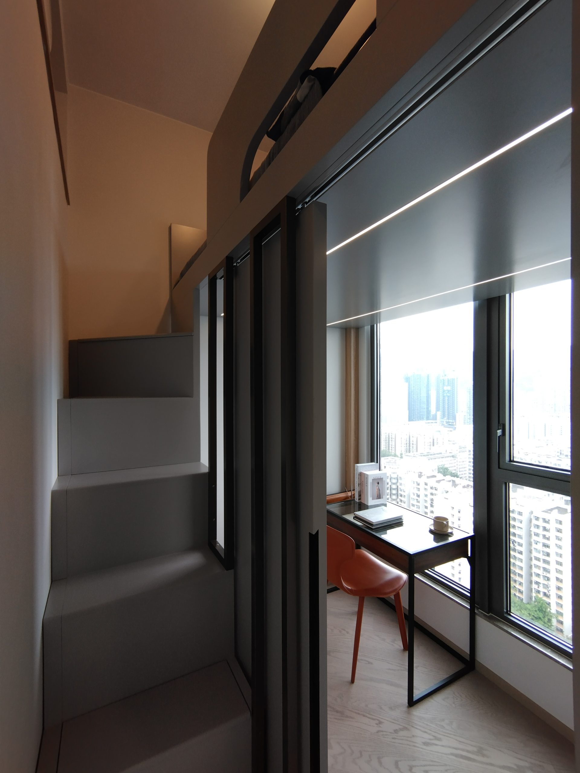 Studio Plus設有度身訂造的一體式家具,明顯分隔寢區、工作間及廳區,擴闊工作空間;一體式傢俱上方為寢區,下方以趟門式設計打造多功能空間,亦可放置書枱及衣櫃成為工作間及衣帽間。樓梯內設有收納櫃,令每處空間用得其所;開放式廚房配備法國品牌De Dietrich的電磁爐、蒸焗爐、歐洲品牌Gorenje抽油煙機。特色廚櫃採用優雅Vert Cypress墨綠色系櫃門,增加室內時尚風格。