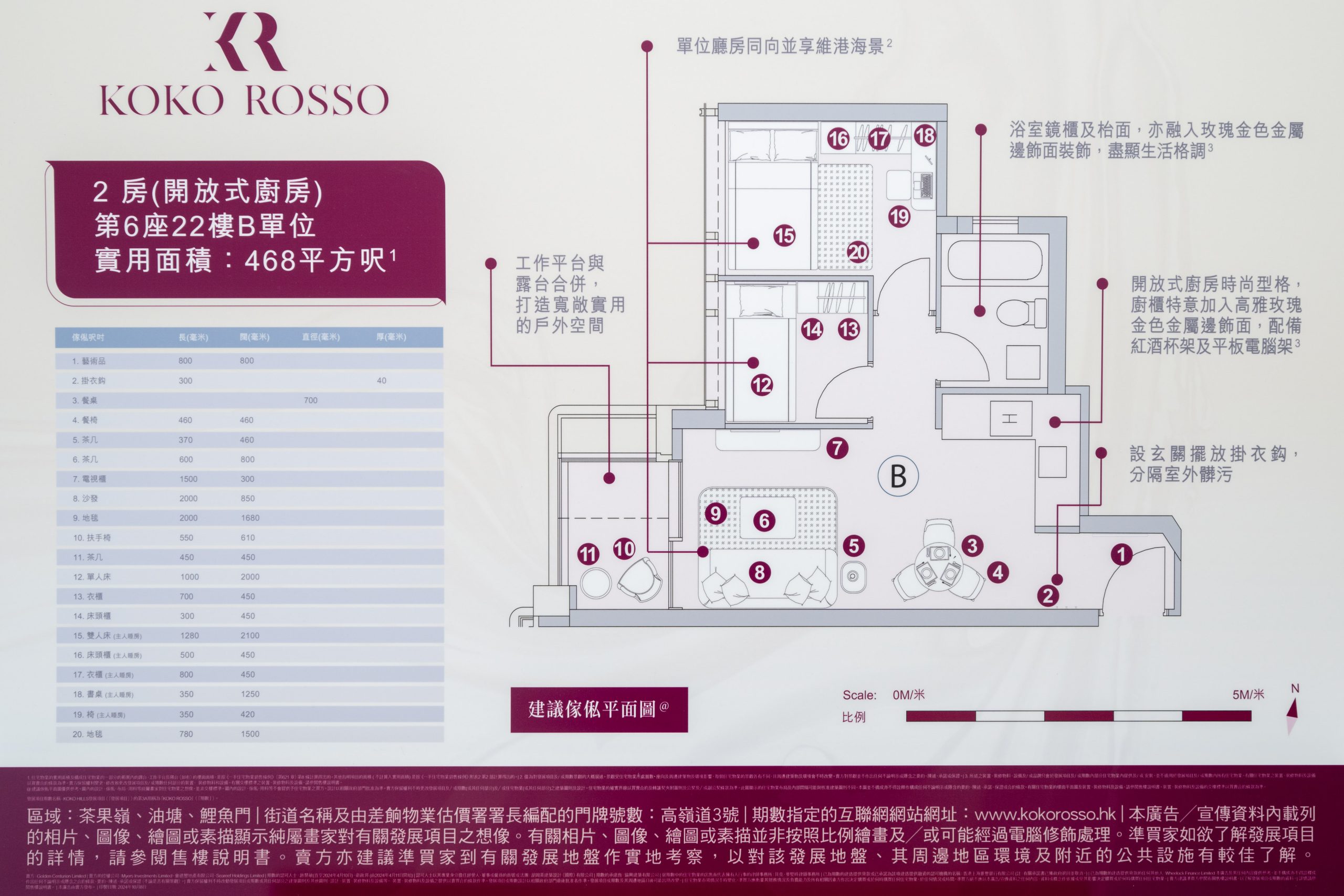 「KOKO ROSSO」第6座22樓B室,連裝修及傢俬示範單位,屬兩房開式廚房戶型,實用面積為468方呎。廳房同向,前臨維港,可欣賞維港璀璨煙花景致,客飯廳方正實用,方便擺放傢俬。單位的工作平台與露台合併,打造出更寬敞舒適的戶外空間,屬 KOKO HILLS 系列中第 3 期獨有設計。開放式廚房配合北意大利 Wine & Dine 主題,廚櫃加入古銅色金屬邊飾面,設計優雅時尚,廚電選用國際著名品牌 SIEMENS雪櫃、洗衣乾衣機、蒸焗爐等。