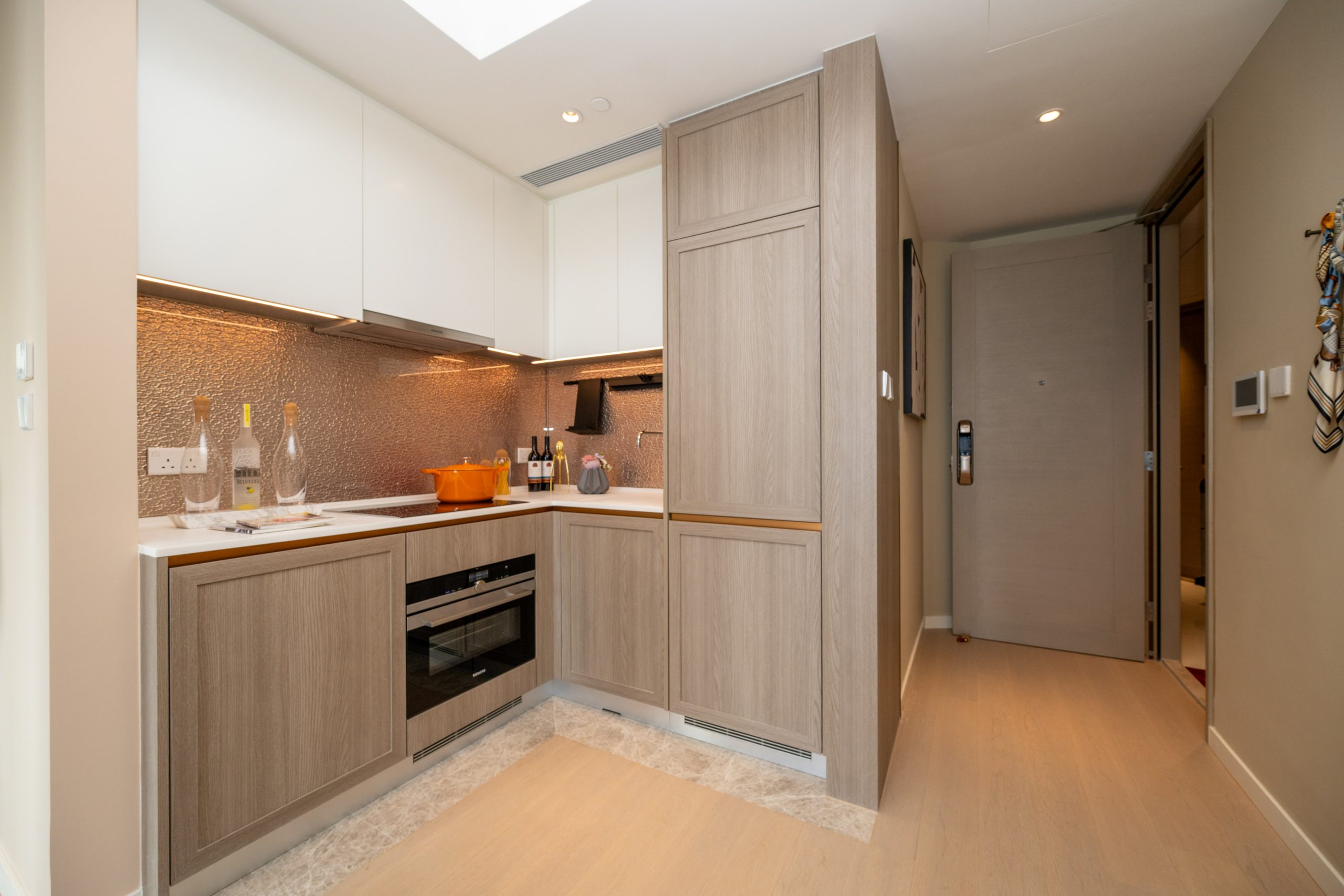 單位不設玄關,客飯廳長7.6米,寬4.1米,闊落實用,可容納一張8人圓餐桌,亦可擺放特長儲物櫃、98吋大電視及弧型大梳發後,空間仍卓卓有餘。單位廚房為梗廚,設窗戶,確保空氣流暢,採用L字形的工作台面,長邊達5米,提供更多料理空間。廚房配以雙鋅盤,附設的家電均為MIELE,齊備3個煤氣煮食爐、燒烤爐、焗爐、蒸爐連微波爐、雪櫃、咖啡機等。梗廚接連工作間,同時亦置洗手間。