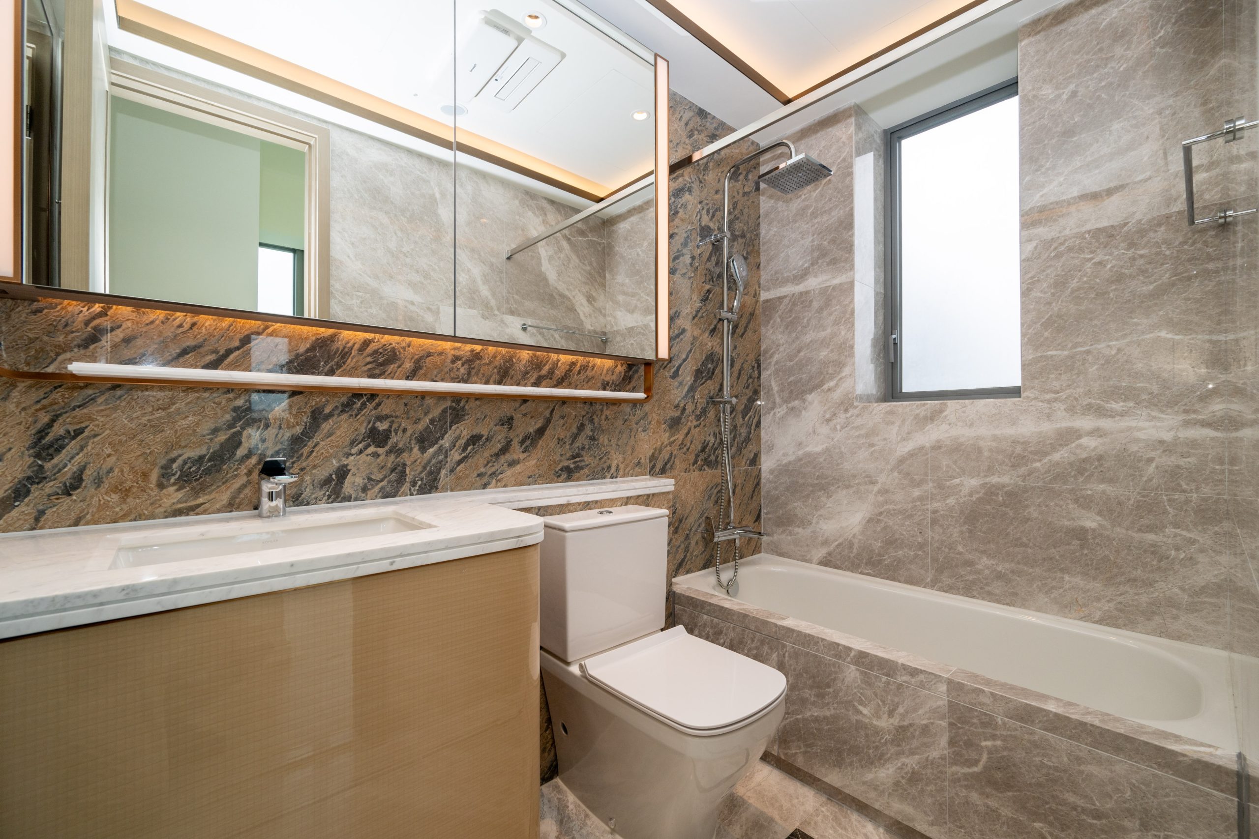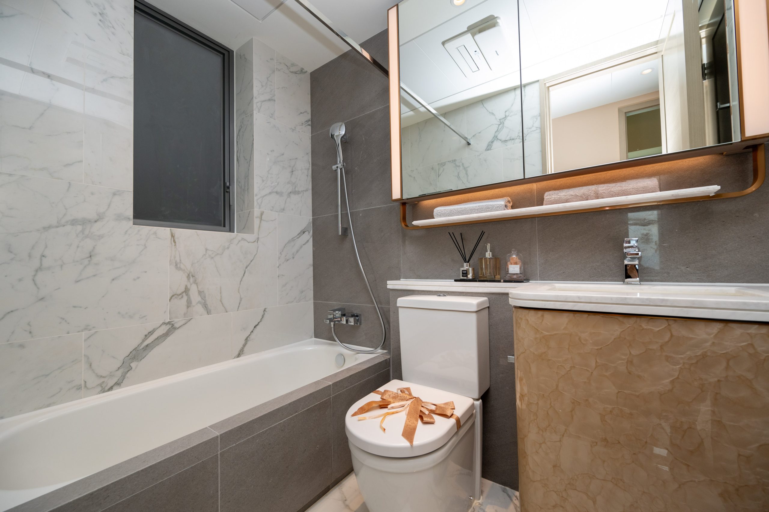 浴室為明廁,可增強採光及通風;浴室鏡櫃及枱面精心配上古銅色金屬裝飾,貫徹北意主題,突顯品味格調;浴室牆身及地板選用意大利進口抗菌瓷磚鋪砌,企缸則選用進口雲石,用料一絲不苟;衞浴用品採用美國品牌KOHLER及德國品牌hansgrohe,並貼心裝設Panasonic浴室寶,保持浴室乾爽舒適;單位配備日本大金空調,並加入抗病毒空氣過濾網,提升空氣質素,打造升級潔淨家;大門配備Samsung智能門鎖,設有指紋、手機App藍牙配對、密碼、門卡及鎖匙5種開鎖模式,住戶可按習慣喜好設定,輕鬆自如。