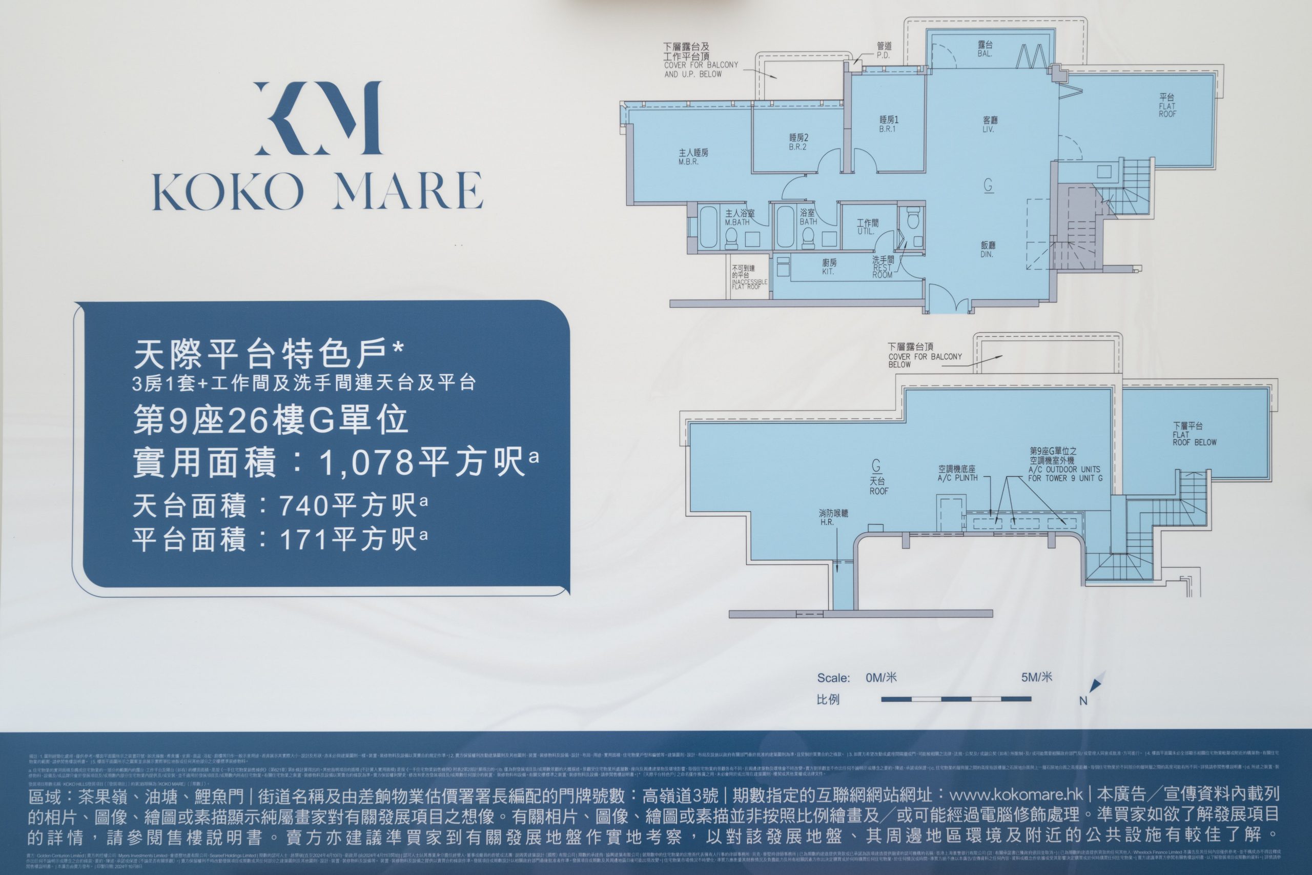 「KOKO MARE」第9座26樓G單位,天際特式單位,三房一套梗廚連工作間及雙平台間隔,實用面積為1,078方呎,適合大家庭。室外面積合共971方呎,包括60方呎露台,171方呎平台以及740方呎天台,為第三期罕有三房以上戶型。