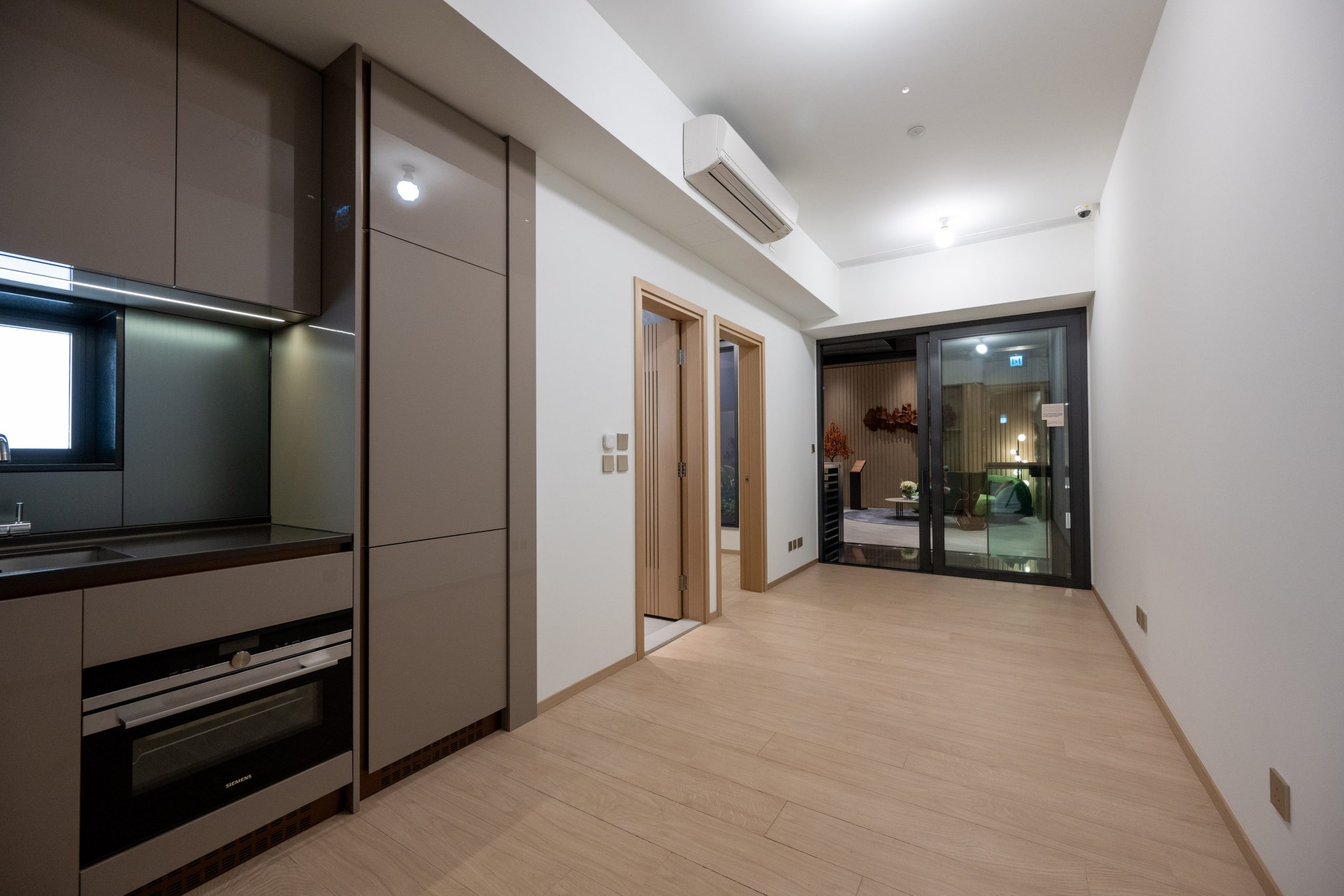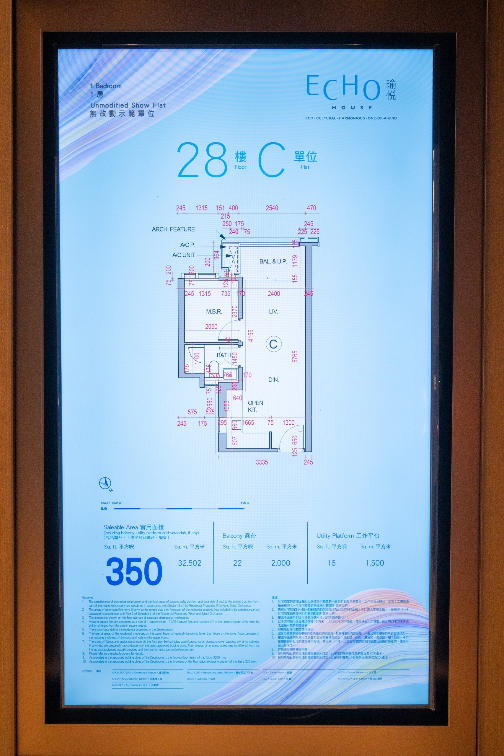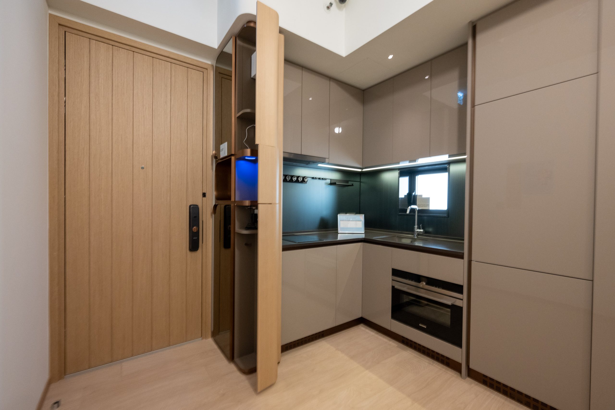 以28樓C室為藍本搭建的一房(開放式廚房)單位,實用面積350方呎,為西南坐向,享西九龍市景及昂船洲海景;樓層與樓層之間的高度為3.26米,空間感充裕,採納自然光線。大門採用實心木門,旁邊預設有「Smart Cabinet」多功能鏡面櫃,既是儲物櫃及鞋櫃,更配備無綫手機充電器、紫外線消毒器,以及雨傘架,方便住戶日常。