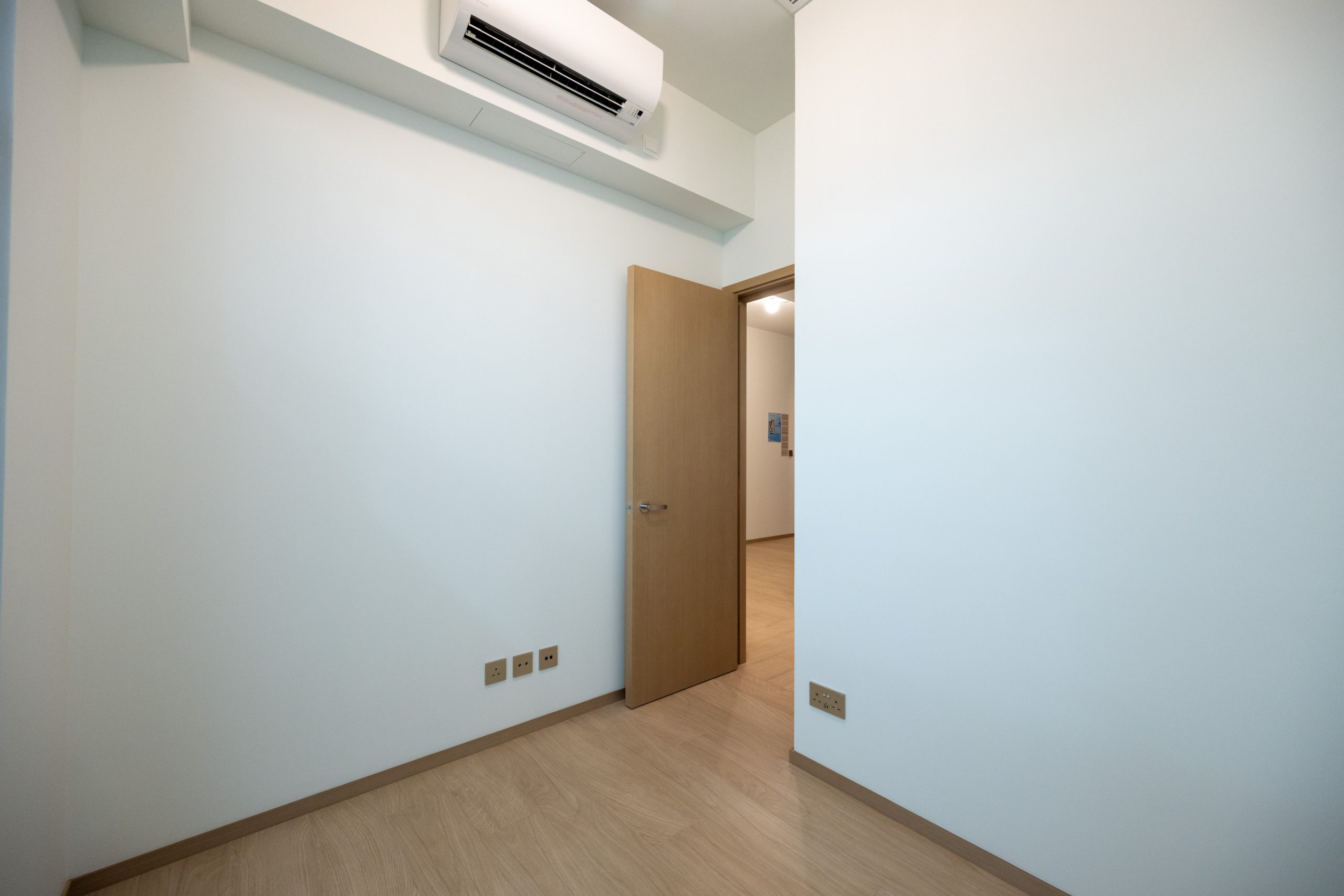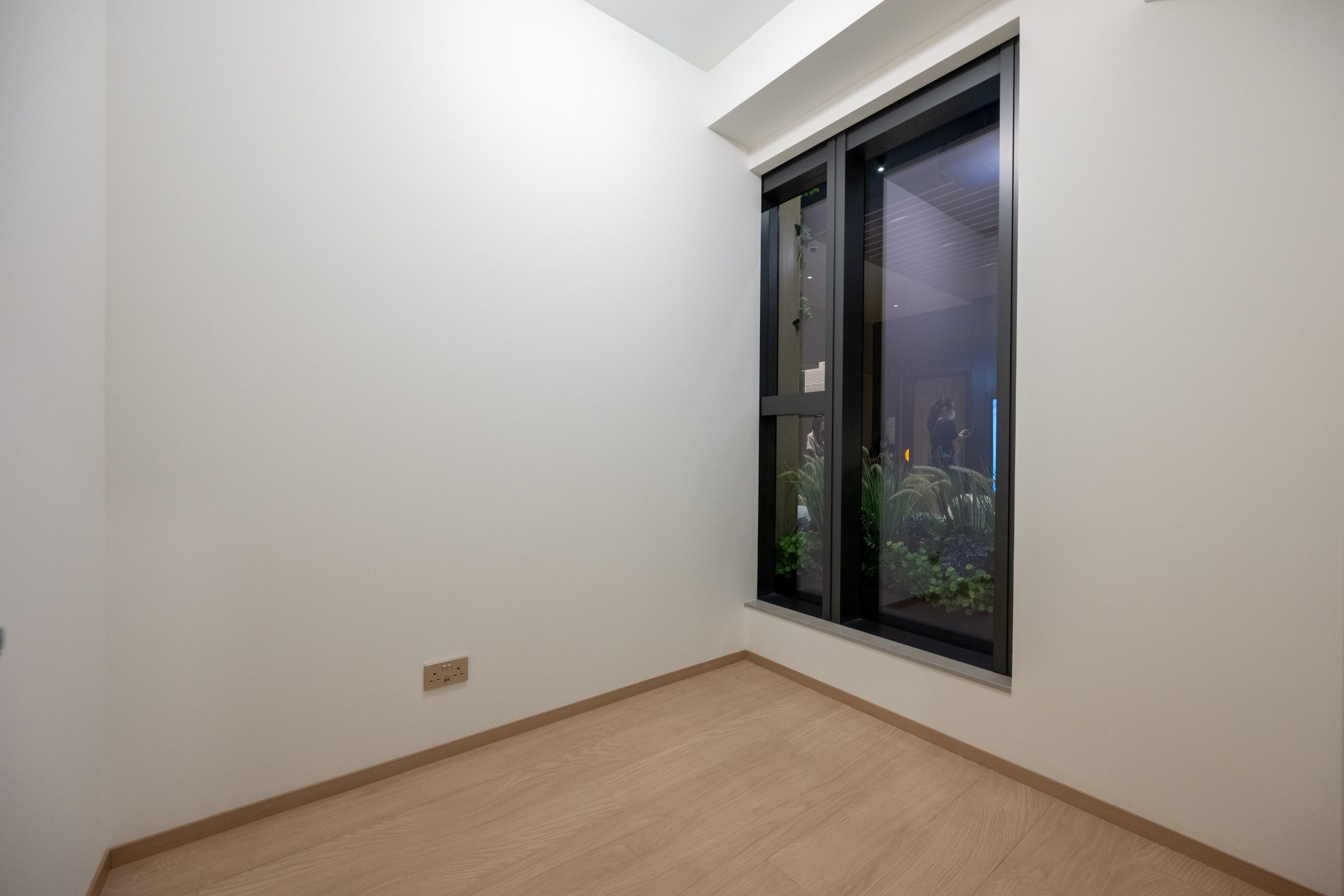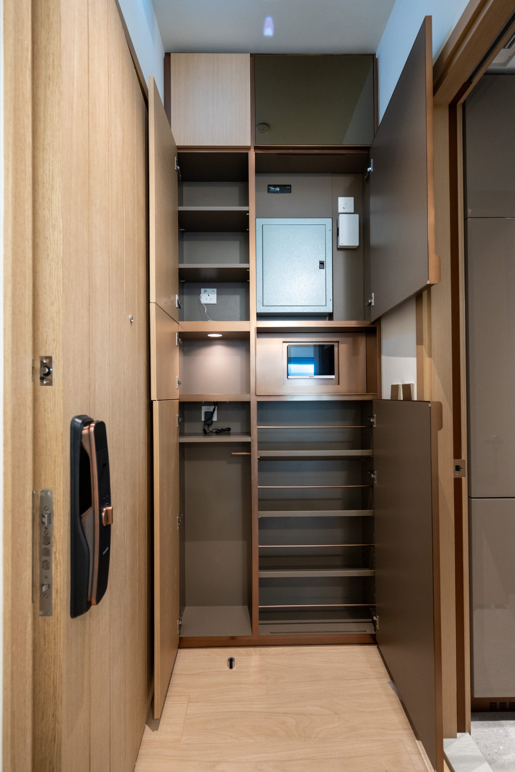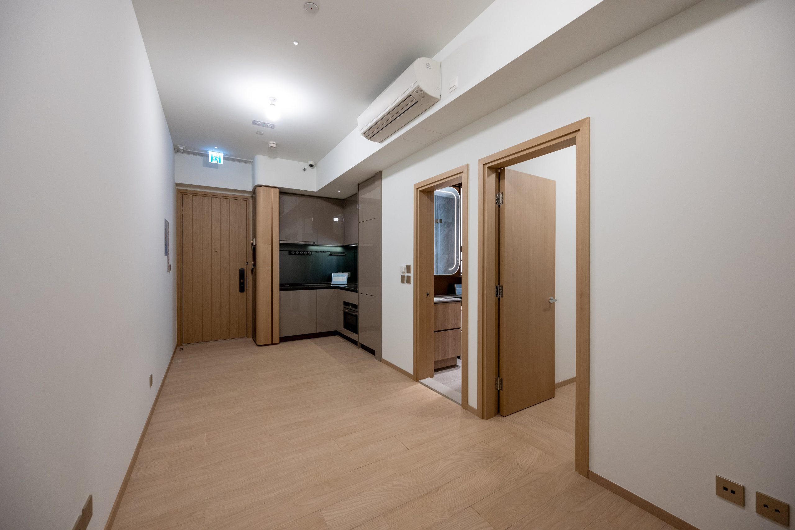 以28樓C室為藍本搭建的一房(開放式廚房)單位,實用面積350方呎,為西南坐向,享西九龍市景及昂船洲海景;樓層與樓層之間的高度為3.26米,空間感充裕,採納自然光線。大門採用實心木門,旁邊預設有「Smart Cabinet」多功能鏡面櫃,既是儲物櫃及鞋櫃,更配備無綫手機充電器、紫外線消毒器,以及雨傘架,方便住戶日常。