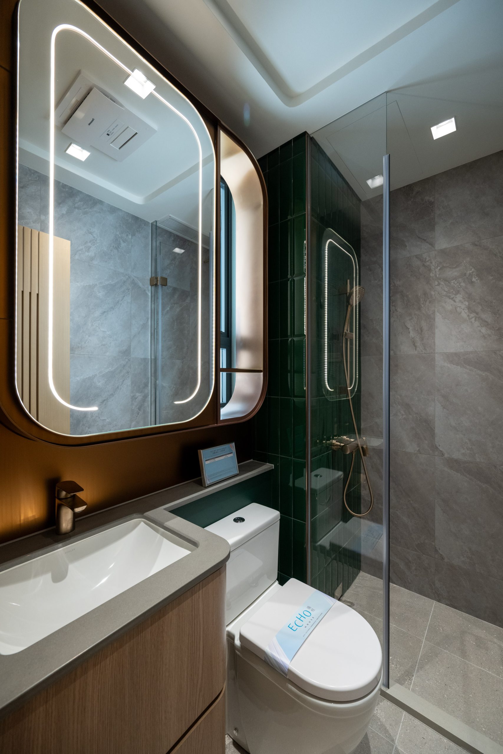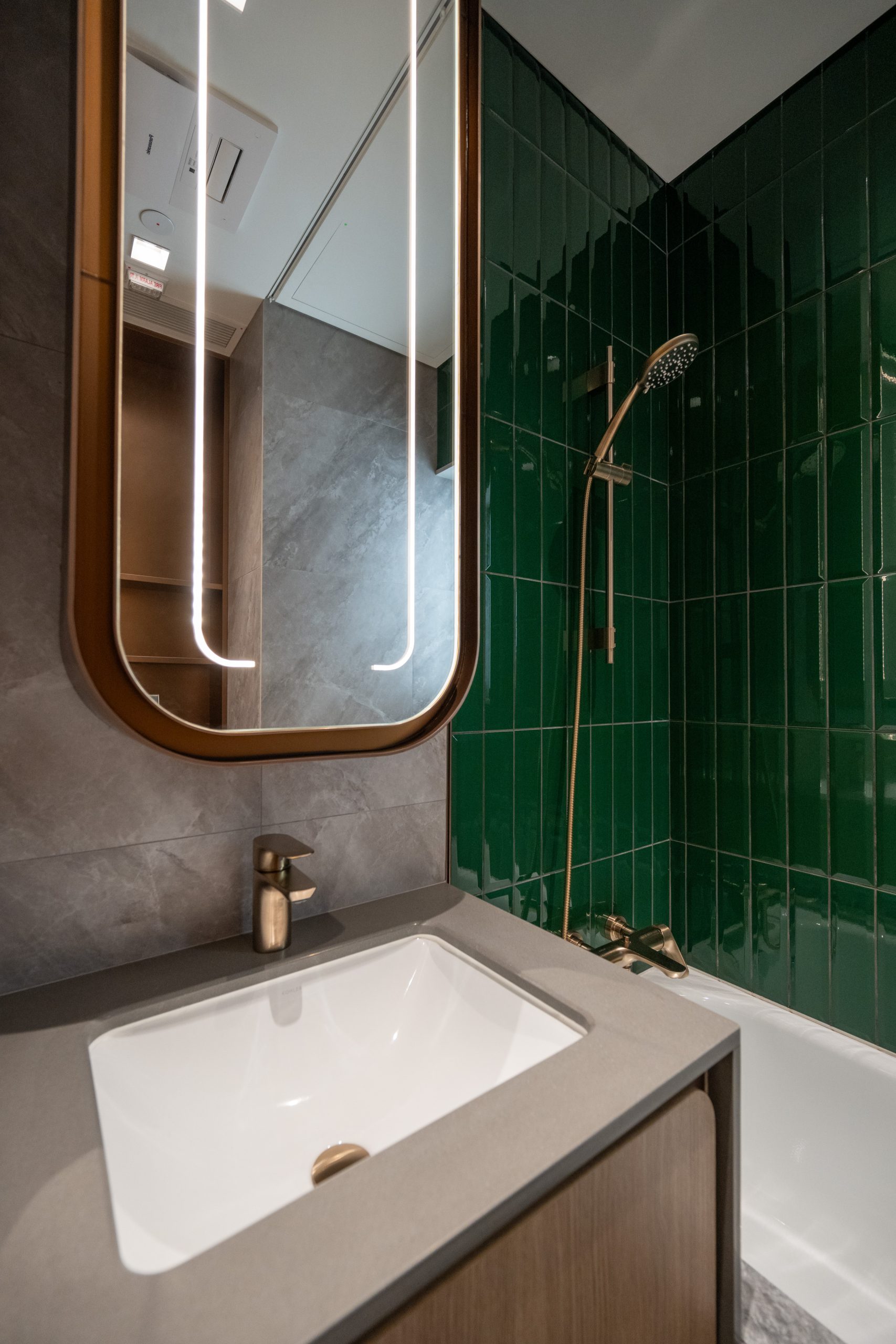 睡房與客廳同樣為東南座向,享西九龍市景及昂船洲海景,間隔方正實用。至於浴室採用明廁設計,嚴選高貴橄欖綠色瓷磚打造牆身及時尚水泥灰色地台北歐風格鏡櫃,金屬邊框,型格時尚,提供充裕的收納空間。淋浴間配備KOHLER型格拉絲銅色花灑及龍頭套裝,配合Panasonic換氣暖風機、以及德國製造電器品牌 Stiebel Eltron即熱式電熱水爐。