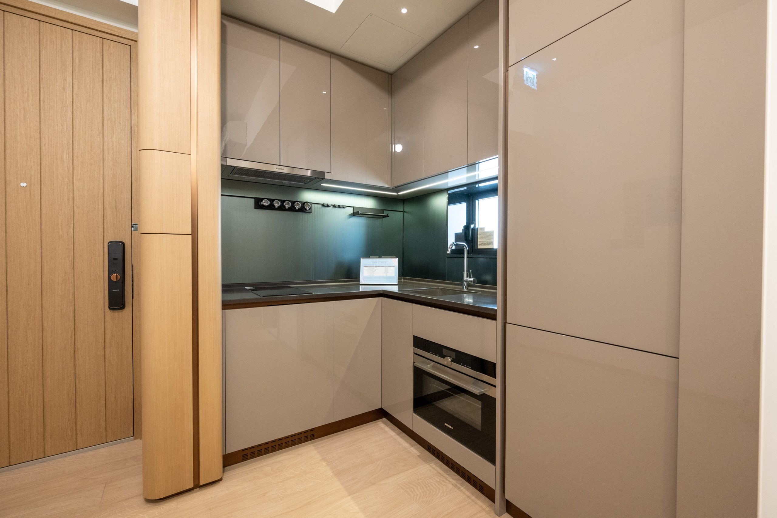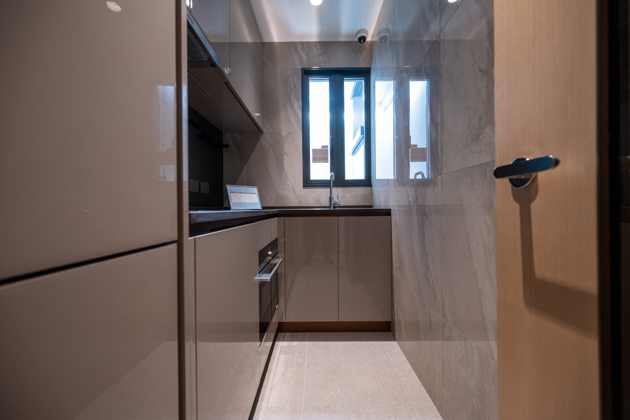 單位採用開放式廚房設計,備有L形工作檯面及窗戶,廚櫃奶茶色,型格時尚,廚櫃設有感應燈,方便用家煮食。廚房選用德國品牌Siemens電磁爐、蒸焗爐抽油煙機、洗衣乾衣機及雪櫃連冰箱,裝嵌於貯物櫃當中,另備有意大利KOHLER水龍頭。