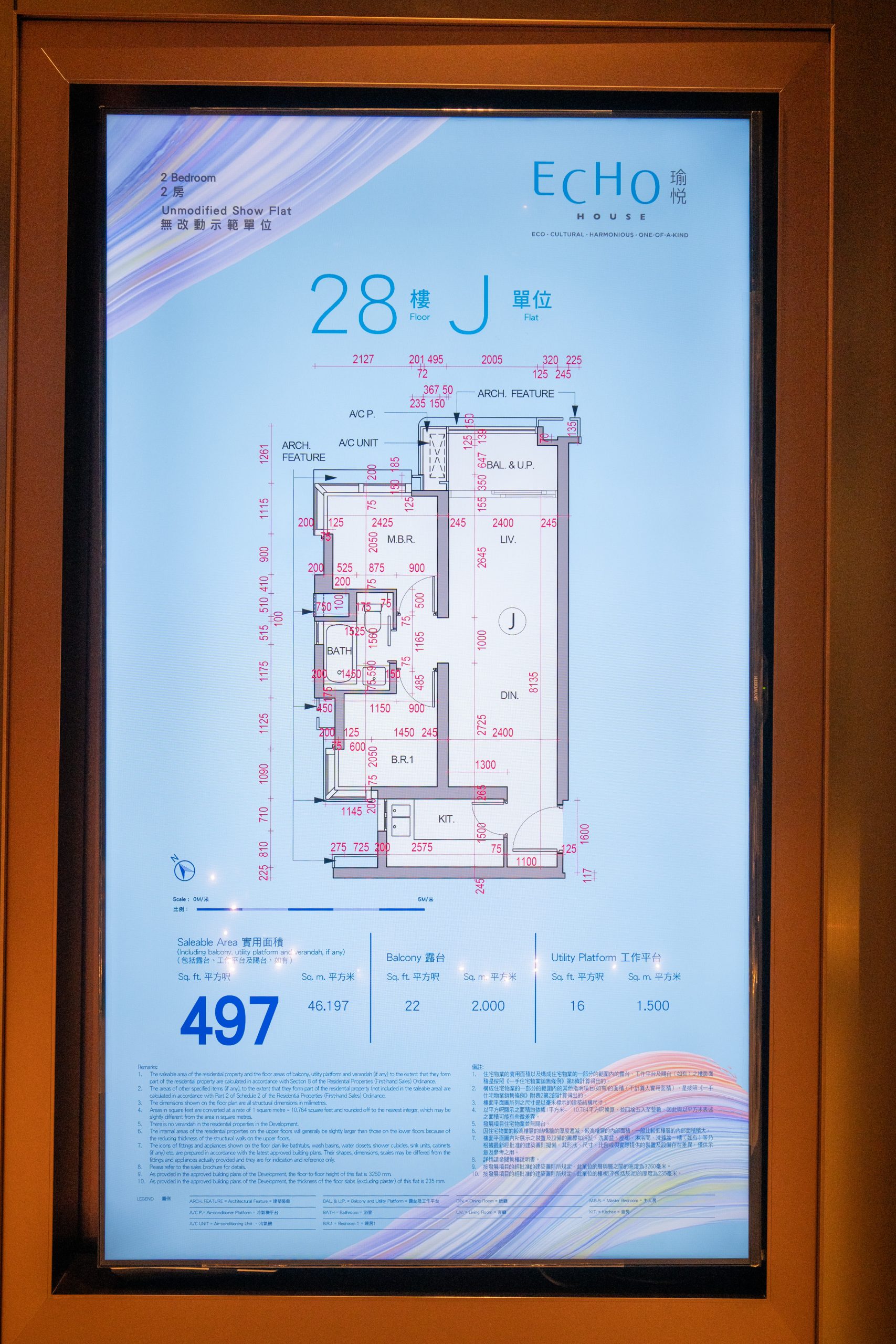 以28樓J室為藍本搭建的兩房(梗廚)單位,實用面積497方呎,單位為東北坐向,享山巒景緻;樓層與樓層之間的高度為3.26米,能採納自然光線並達到引景入室的效果。