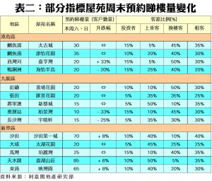 至於,港島區8個指標屋苑於本周末暫錄185組客戶預約睇樓,與上周持平。利嘉閣地產太古城分行首席聯席董事林俊傑表示,港島及九龍區一手推盤攻勢強勁,代理兵力及客源均暫傾向一手市場,減息及政策出台後買家對後市的看法明朗化,整體市場氣氛不俗,太古城本月至今暫錄約22宗買賣,本周末預約睇樓量則大致平穩。