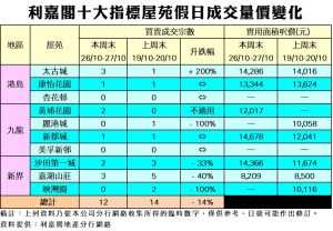 《利嘉閣十大指標屋苑假日二手實況》 新盤暢旺成焦點 二手提價議幅收窄 十大屋苑兩天錄12宗成交 按周減少14%
