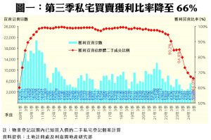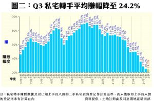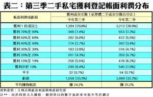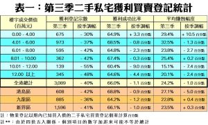至於平均獲利幅度方面,今年第三季每宗私宅轉手個案平均賺幅只有24.2%,較第二季的25.2%再跌1個百分點,除連跌5季外,更創2010年第一季以來的59季(即近15年)新低,反映樓價不斷尋底外,亦多了短線持貨業主離場,令整體平均賺幅徐徐下降。當中,沽樓獲利1倍或以上的轉手個案佔整體二手私宅買賣比例維持在三成以下徘徊,只達29.8%,惟按季微升0.9個百分點,涉及宗數達1,394宗。此外,第三季虧損個案錄得1,558宗,佔比增至33.3%,相關比例按季增加1.1個百分點(詳見表二),以宗數計,為2009年第四季以來的60季(即15年)次多,反映撤辣及高息環境下,蝕讓急沽情況仍不少;至於平手者則有32宗,佔比按季持平在0.7%。