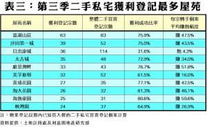 若以屋苑計算,第三季二手私宅獲利登記宗數最多的屋苑前兩位分別是嘉湖山莊及沙田第一城,各錄63宗及39宗登記,獲利成功比率分別達75.9%及75.0%。至於十大獲利登記宗數最多屋苑之中,則以海逸豪園的每宗轉手個案平均賺幅最大,達59.6%;而表現最差者為日出康城的蝕4.3%,亦為榜內獲利成功率最低的屋苑,只達31.6%。