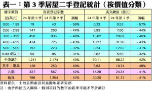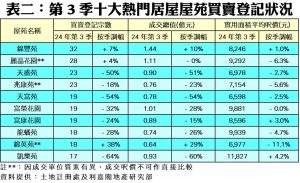 如按屋苑細分(見表二),2024年第3季長沙灣凱樂苑錄17宗買賣,按季大減64%,而上述屋苑成交總值錄約9,342.6萬元,較次季同步銳減六成。至於馬鞍山錦豐苑則以32宗買賣成為登記量最活躍的屋苑,成交總值達1.44億元;而緊隨其後的九龍灣麗晶花園季內亦錄28宗登記,涉資約1.11億元。