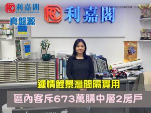 劉氏表示,新買家為區內客,早前經利嘉閣真盤源平台搵樓,見上述放盤即約代理睇樓。客人心儀單位間隔方正合用,光猛舒適,加上屋苑地理位置優越,毗鄰港鐵站,民生所需齊全,睇樓後即進行洽購。業主原以868萬元放售,經誠意洽商後以673萬元成交,折合實用面積呎價約12,556元,略低於市場水平。