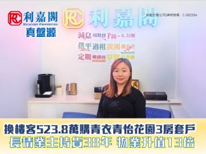 換樓客523.8萬購青衣青怡花園3房套戶 長情業主持貨38年 物業升值13倍