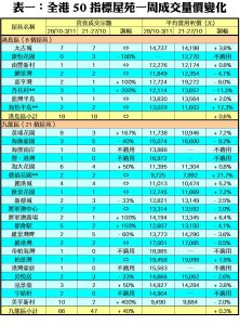 至於,港島區8個指標屋苑上周共錄18宗交投,與前周的宗數相同,當中杏花村成交量由前周的1宗,增加2倍至上周的3宗;嘉亨灣期內錄得2宗買賣,按周增幅達1倍;藍籌屋苑太古城期內錄得7宗交投,保持前周的數字。此外,在全港50個指標屋苑之中,上周共有5個屋苑錄得「零成交」,較前周的11個減少55%,當中港島區及新界區各佔1個及4個屋苑,九龍區則全線屋苑均能錄得成交(詳見表一)。