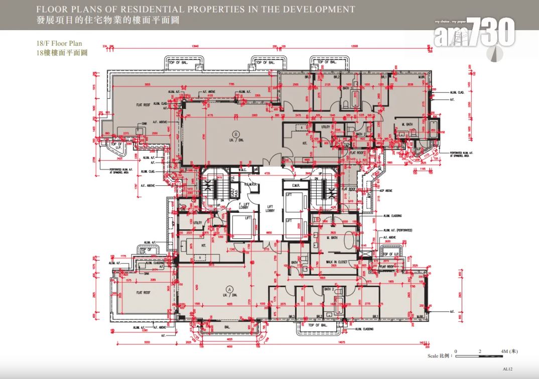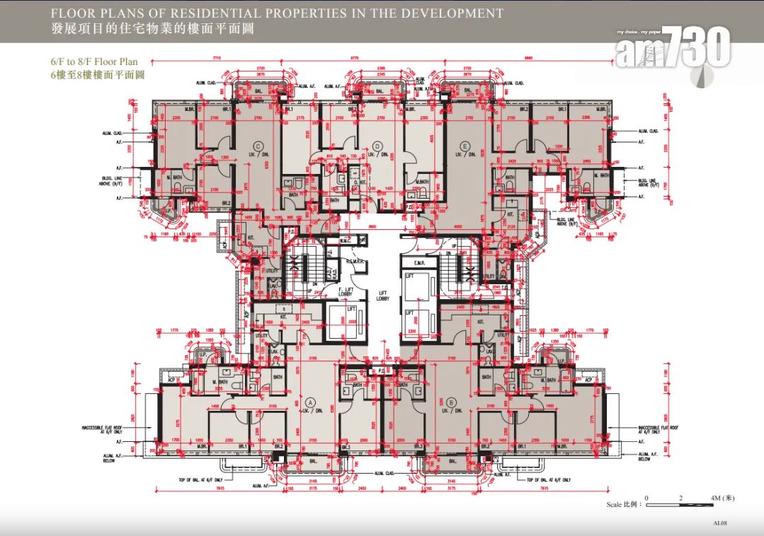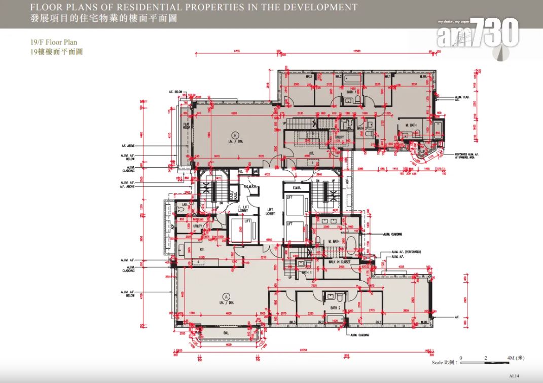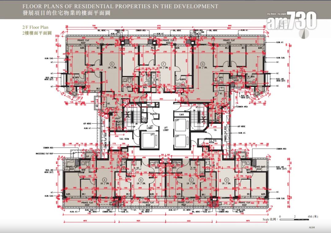 至於全盤面積最細單位為2至5樓的B及C室,實用面積375方呎,兩房間隔,全盤面積最大為18及19樓A室,實用面積均為1,748方呎,四房間隔。