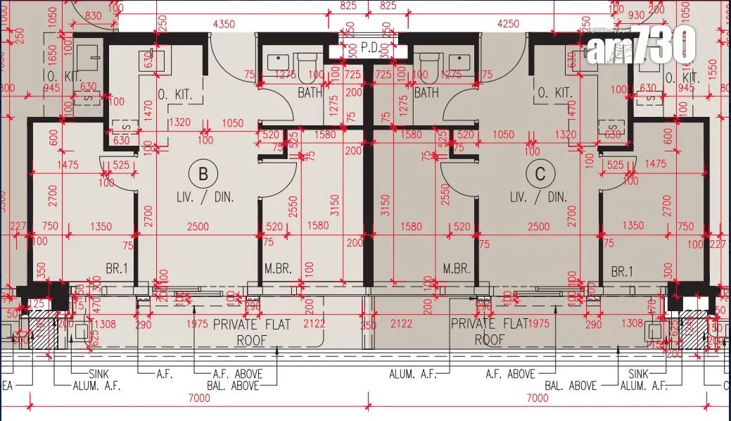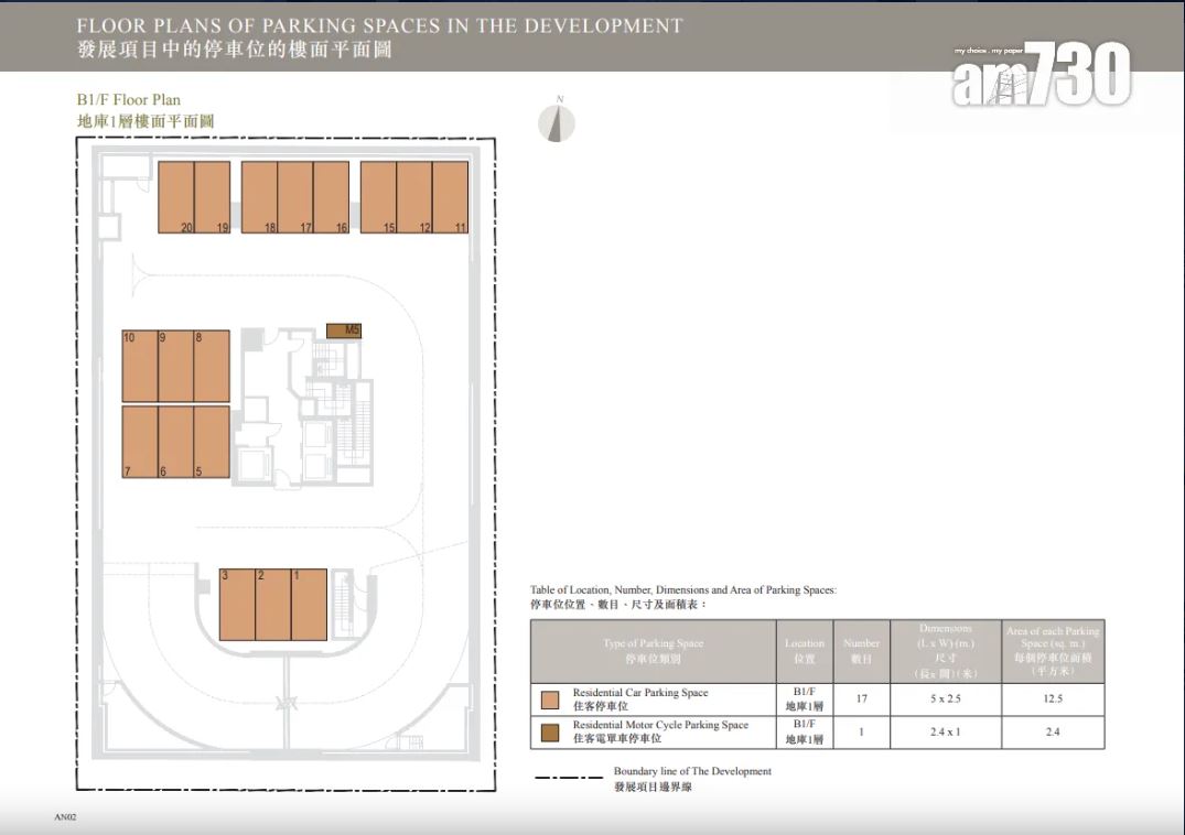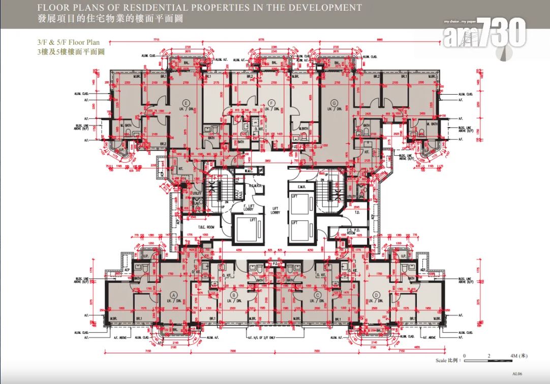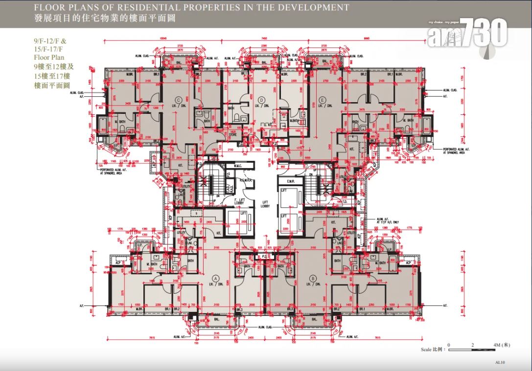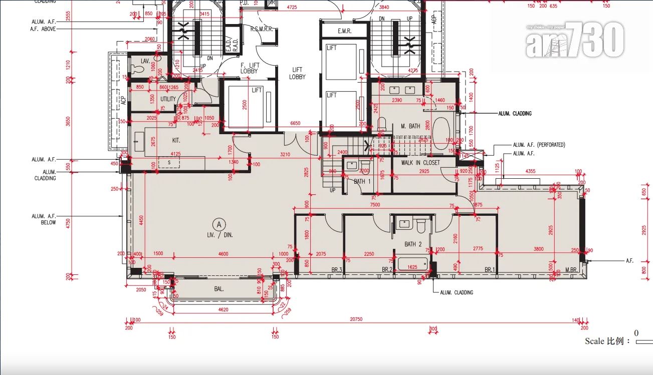 至於全盤面積最細單位為2至5樓的B及C室,實用面積375方呎,兩房間隔,全盤面積最大為18及19樓A室,實用面積均為1,748方呎,四房間隔。