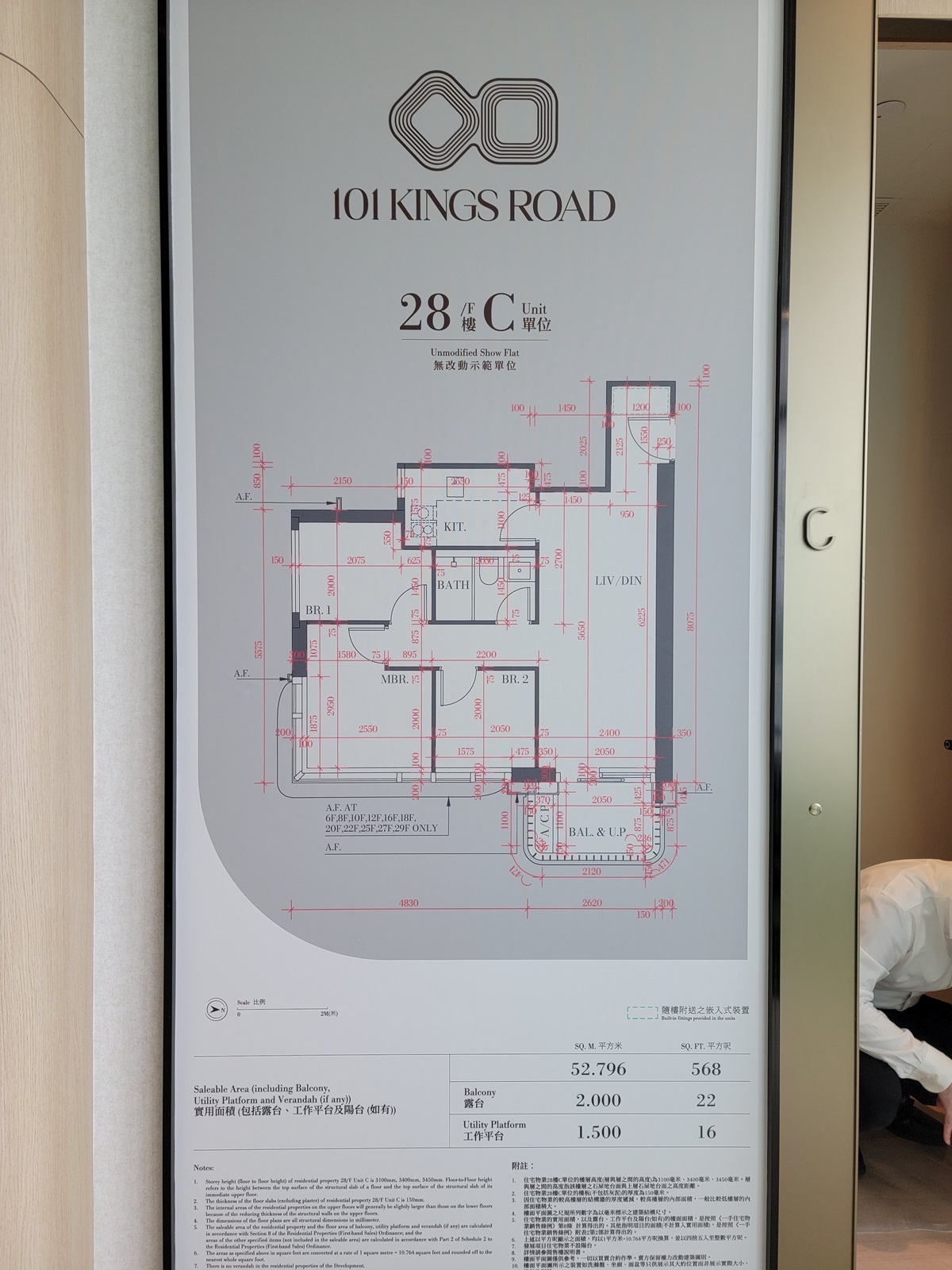 宏安地產北角炮台山新盤「101 KINGS ROAD」提供251伙,實用面積由204至1,291方呎,戶型涵蓋一房至四房。發展商特邀國際知名建築及室內設計事務所Studio PDP主理經改動示範單位,其中以28樓C室為藍本而打造的經改動示範單位,實用面積568方呎,三房戶型,層與層之間的高度最高約3.45米,空間感十足。