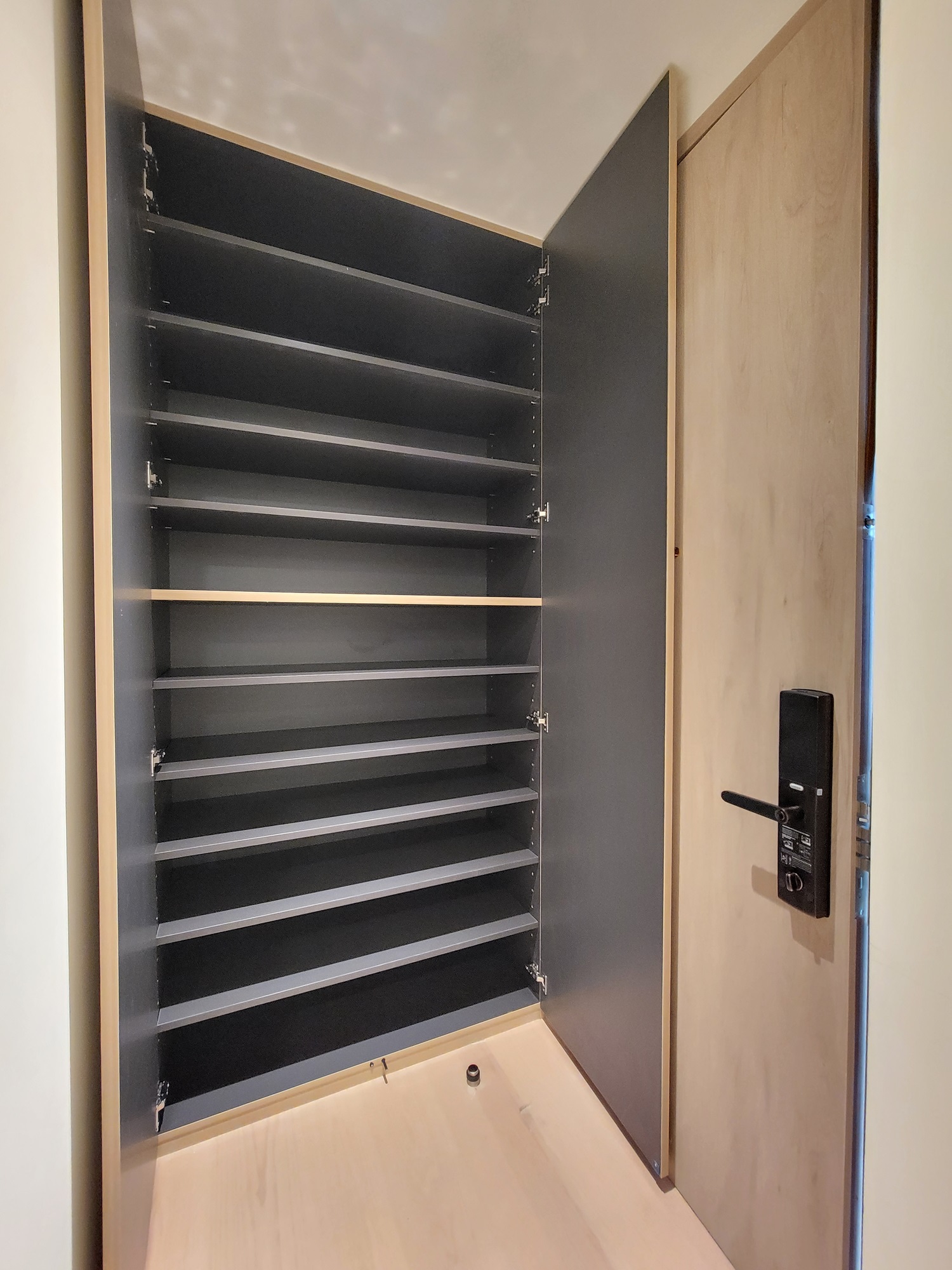 單位玄關位置展示藝術油畫,右側設有灰色到頂鞋櫃連全身鏡,配備米白色換鞋凳,提供儲物空間。長形客飯廳連玄關長逾6米的長方形客飯廳,展現極佳的空間感。大理石地板和黑色金屬元素營造高級質感,而三座位梳化上的牆身掛上經典影視作品的風格照作裝飾。