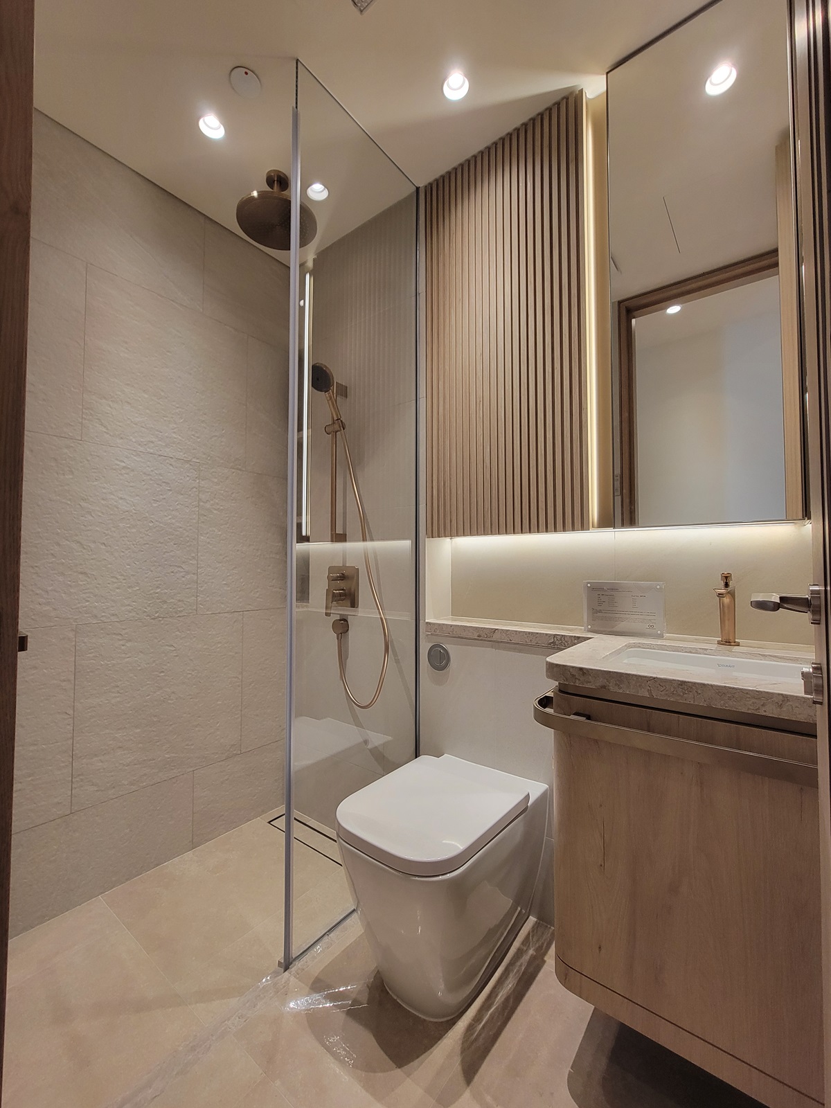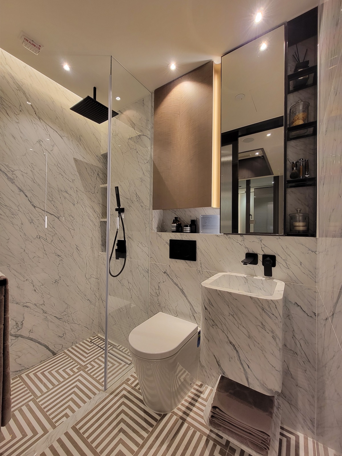 浴室使用大量雲石質感的元素,以灰白為主色調,設計師以長虹玻璃趟門取代原有的木門,增添時尚和層次感。雲石洗手盤下方配備毛巾收納空間,地面採用幾何圖形地磚配合雲石牆身,以金色為點綴,簡約直線設計凸顯空間的現代感,配備頂級衛浴裝置,華麗與實用兼具。