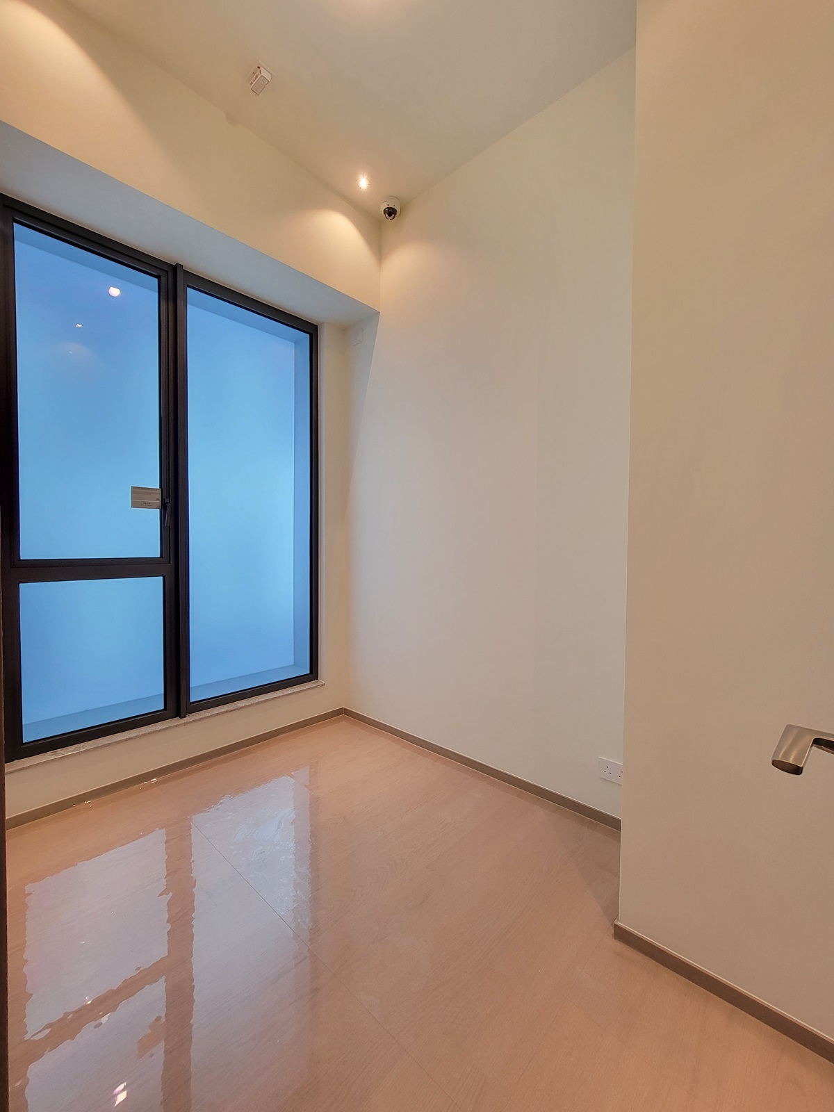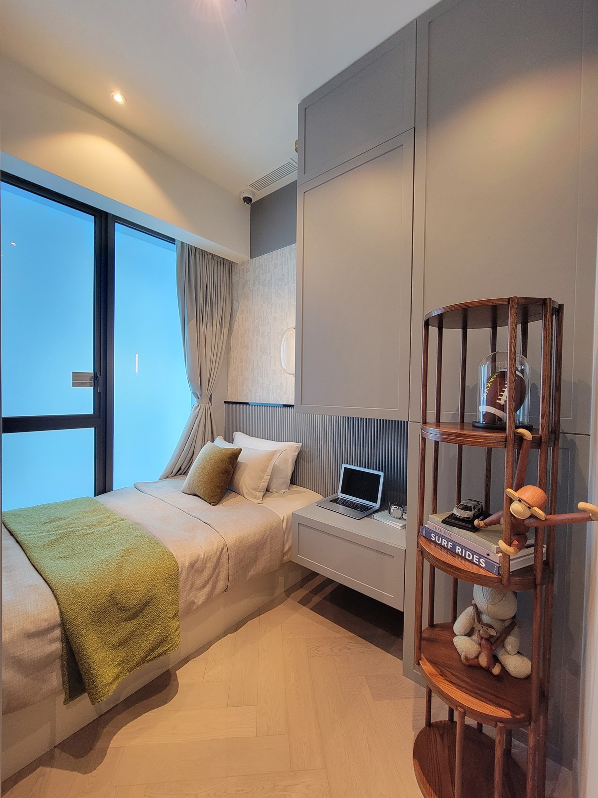 睡房2則改造成一個舒適的酒廊空間,放置米白色日間床配合深木色牆身設計,為繁忙的都市生活中建構愜意的私人空間。睡房1單人大床使用灰白配合綠色床品,配合落地窗設計打造明亮溫馨的睡房,坑紋裝飾牆身,四層木色展示架。