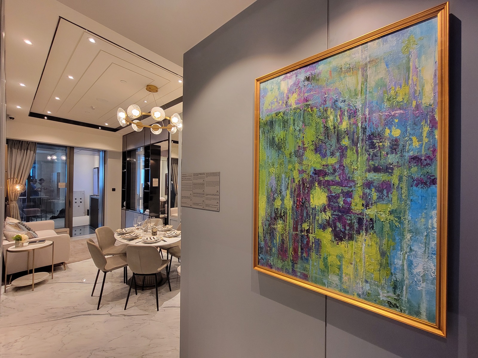 客飯廳特設6人雲石橢圓形餐桌配合幾何圖案餐盤,以及黑金配色餐具,餐椅使用灰色皮藝更添典雅,餐桌旁的鏡面裝飾,另一側牆面掛著大幅藝術畫配合鮮黃色的植物營造視覺層次,上方懸掛一盞圓形特色水晶吊燈。