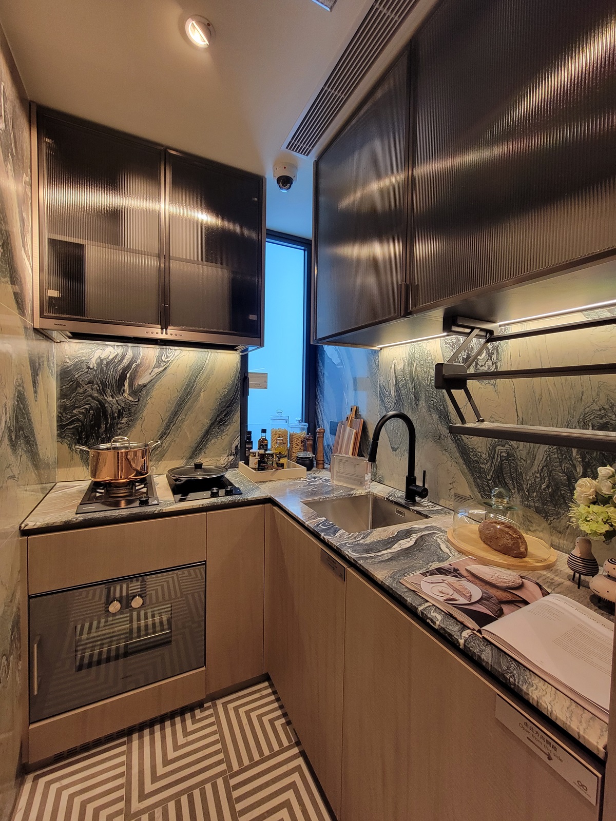 廚房空間與裝飾性元素並存,深色大理石牆面以及黑色幾何圖案地面增添視覺張力,使空間更明亮寬敞。