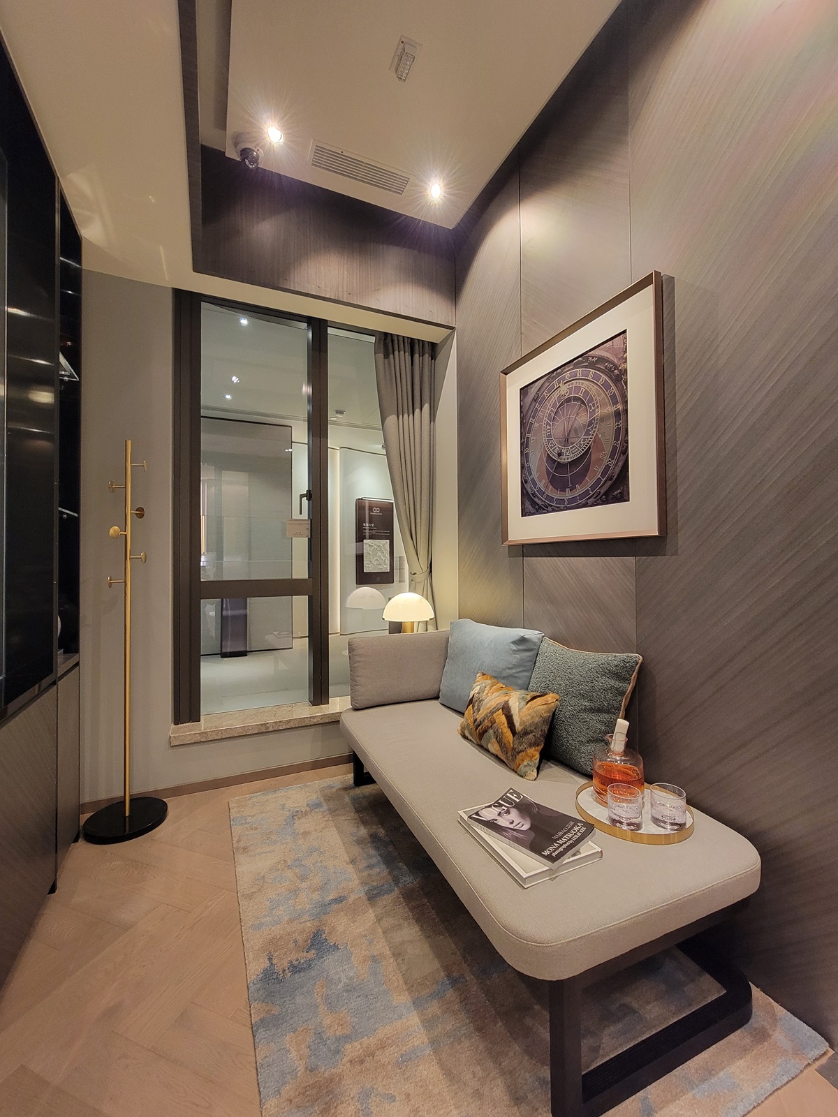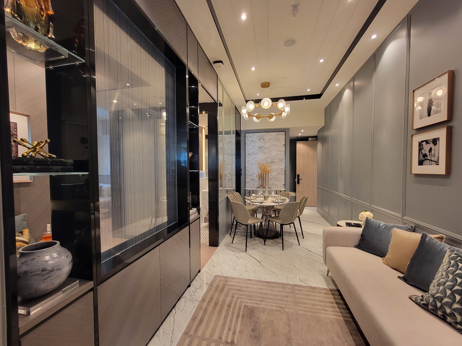 28樓C室經改動示範單位以「Hollywood Glam」風格為其設計概念,整體以冷色為主調,配合高光漆面、金屬裝飾以及藝術裝飾風格作為點綴,奢華的水晶吊燈配襯大理石地板,柔和現代元素和古典優雅的設計風格,為住戶提供豪華而獨特的生活體驗。