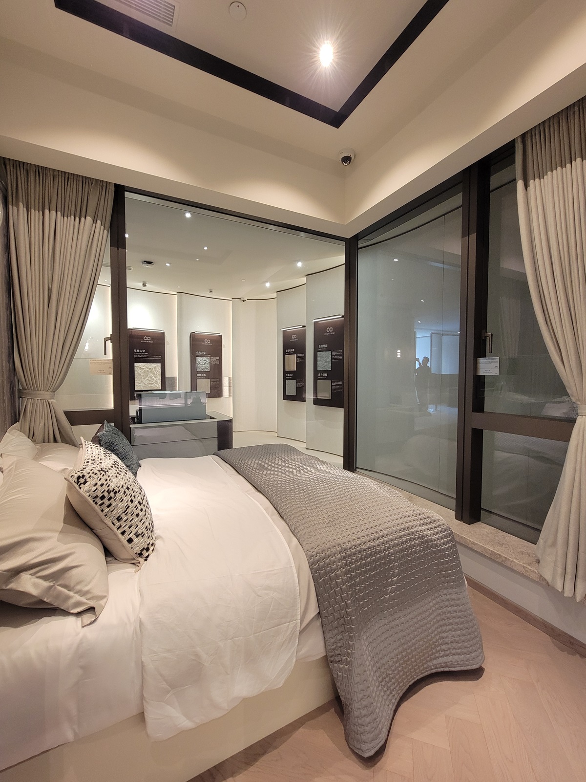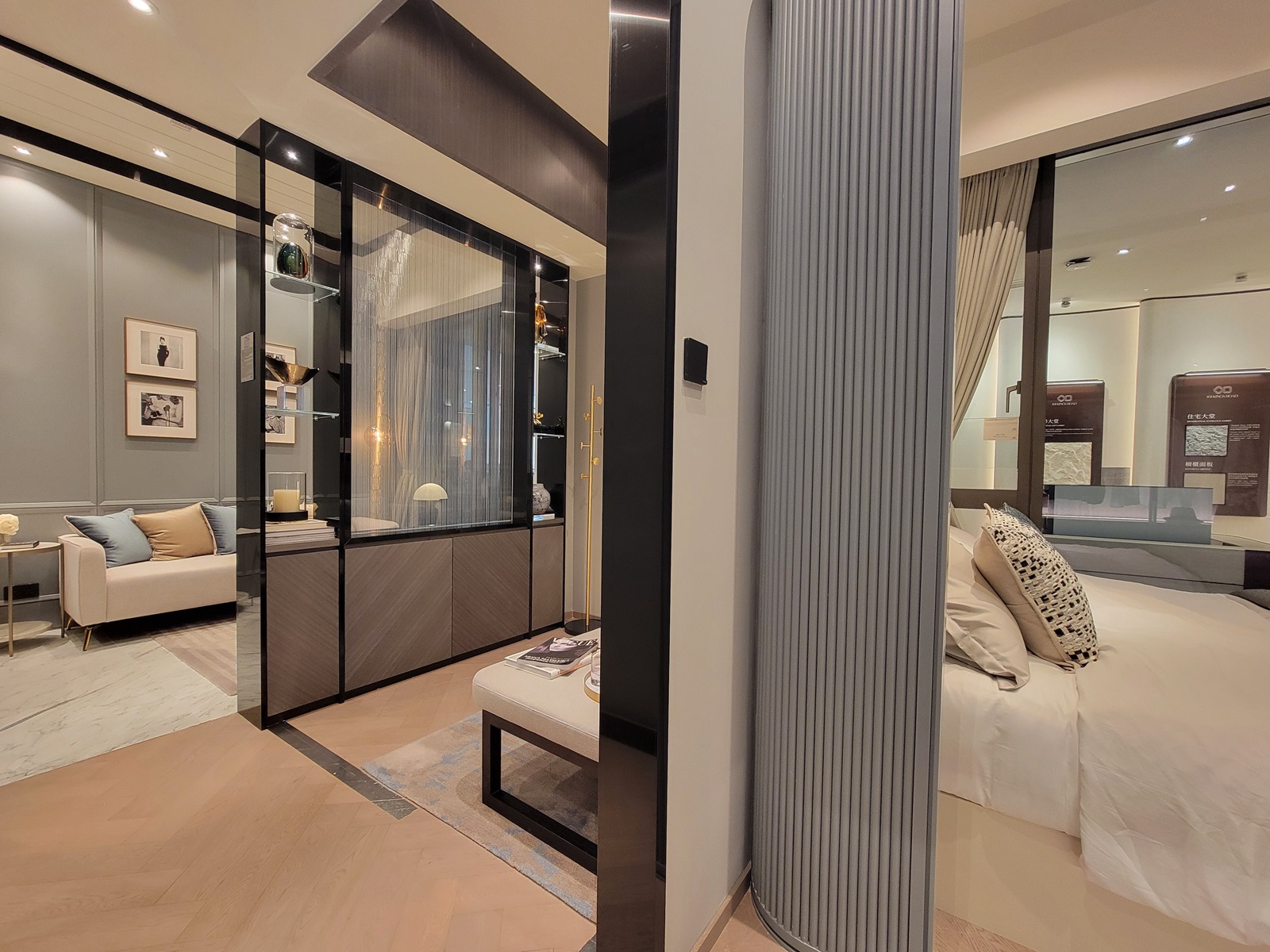 主人房與客飯廳同向,主人房更特別提供特大轉角玻璃窗設計,配合隔熱隔音的雙層玻璃設計,讓自然光線傾瀉入室內,將城市景觀一覽無遺。經改動示範單位將原有的間隔牆打通,並以衣櫃作為分隔,提供充足收納空間,玻璃衣櫃門增強通透感,運用細膩優雅灰色調和金屬色調裝飾,內置多組層架,方便收納的同時亦適合展示各款時尚單品,地面使用暖色木地板,雙人大床配以典雅簡約的黑白灰色系點綴金色質感配件,營造出高雅、奢華氛圍的同時,提升房間的舒適感。