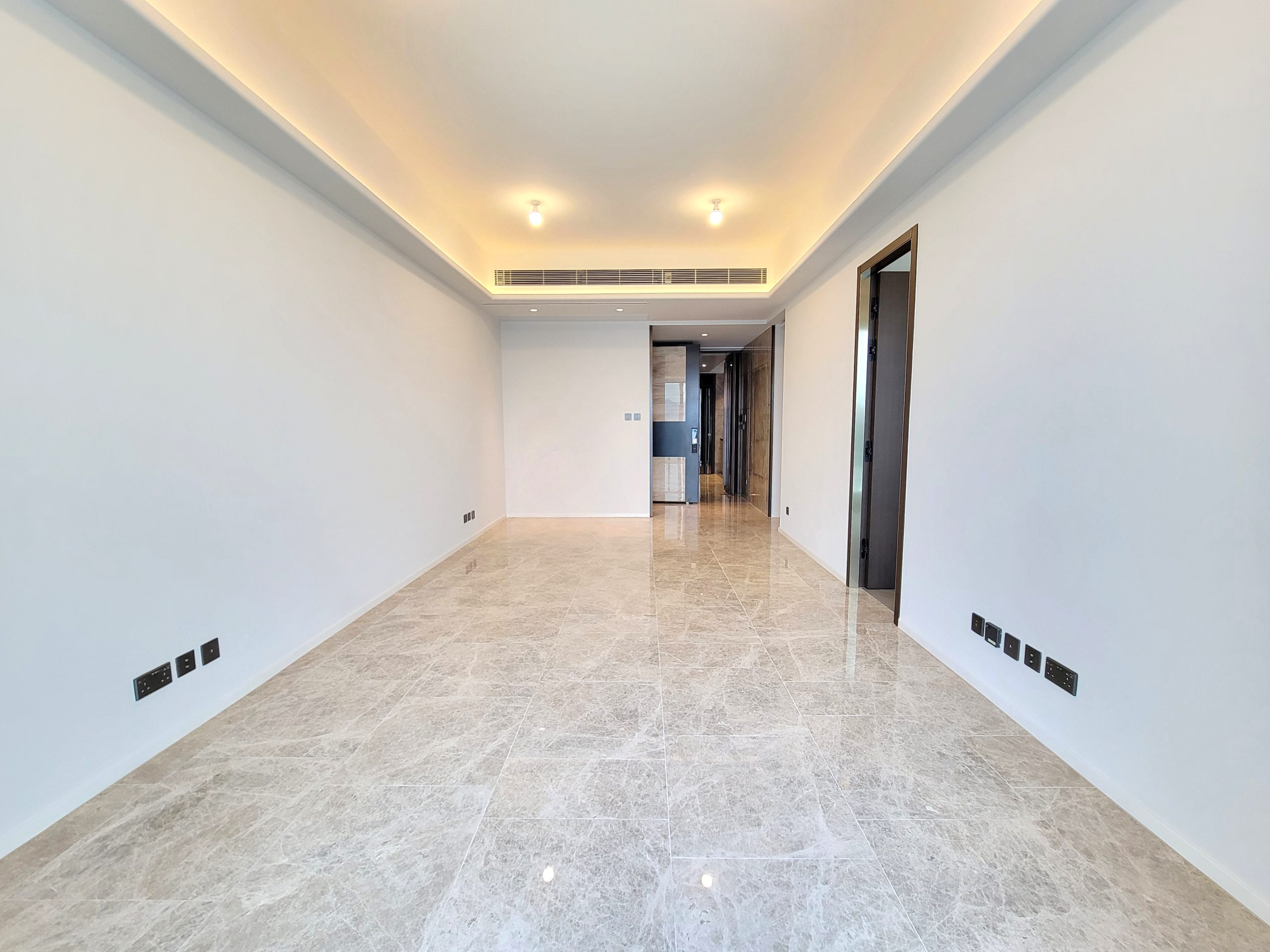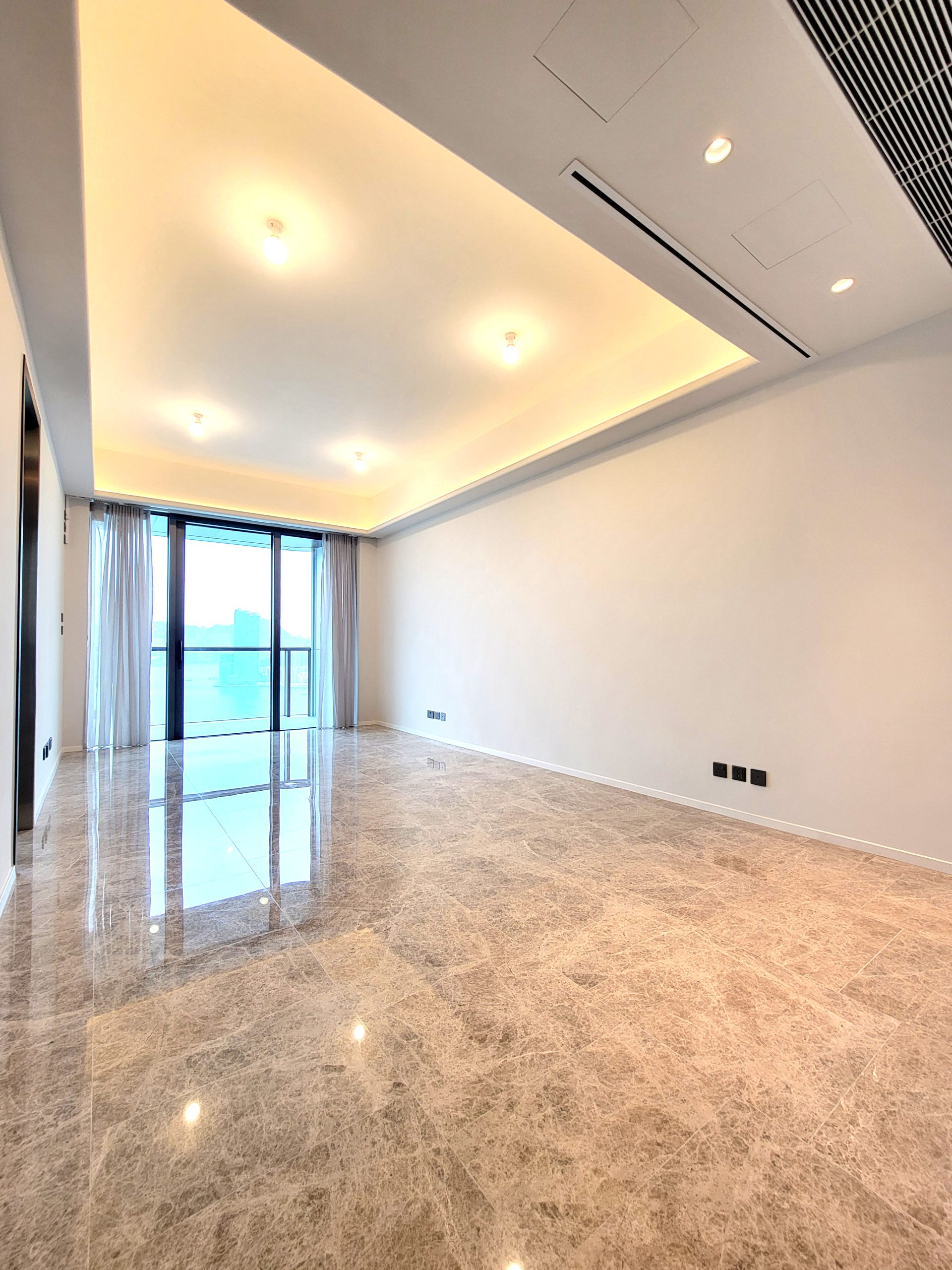 客飯廳長約6.7米、闊約3.5米,間隔方正實用,布局分明。全落地玻璃趟門接連約3.3米闊的啞金色流線型露台,除將自然光引入室內,更可晝夜鑑賞世界級環迴醉人維港景色。