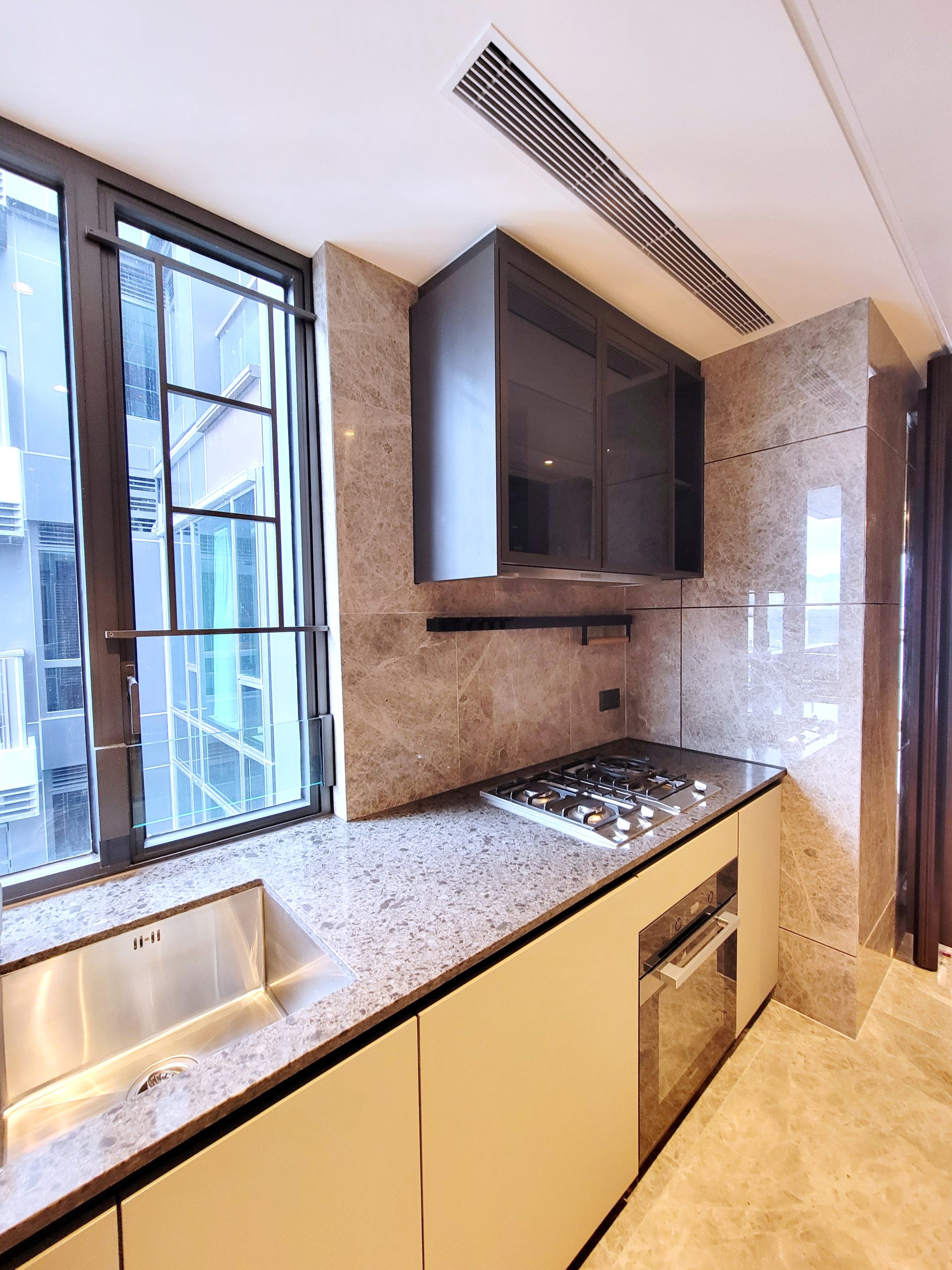 廚房所有家電均選用德國品牌Miele,包括煮食爐、焗爐、雪櫃、食物保溫櫃、咖啡機、真空處理櫃及洗衣乾衣機等;廚櫃選用德國品牌LEICHT,時尚美觀。廚房連接工作間及洗手間,設計貼心實用。