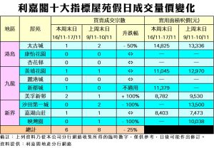 利嘉閣地產總裁廖偉強表示,銀行減息雖為樓市帶來正面影響,惟內地量化寬鬆規模未如市場預期,經濟提振效力受限;加上近日股市表現波動,買家暫對後市抱持觀望態度,令整體二手市況依然淡靜。綜合利嘉閣地產分行網絡數據,在過去的周六日(11月16至17日)十大指標屋苑錄6宗二手成交,較對上個周六日(11月9至10日)的8宗,按周減少25%,連續三周於單位數水平反覆上落。
